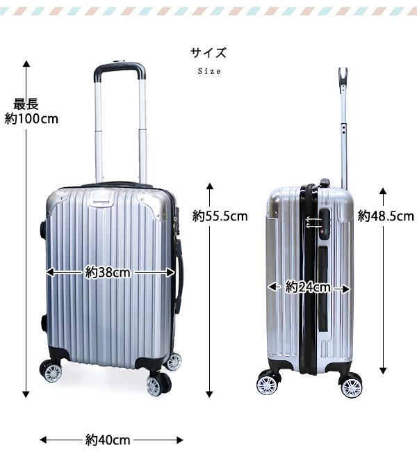 | ■スーツケース【機内持ち込み】について 国際線・国内線(100席以上)の機内に持ち込みに適合したサイズとなっております。 LCC・MCCを除く航空会社で機内持ち込みしていただけます。また路線、飛行機の種類により機内に持ち込む事が出来ない場合がございますので、予めご了承願います。 ■キャリーバーで本体を持ち上げないで下さい。 ■キャリーバーには生産時に使用する潤滑油が付着している場合がございます。その場合は拭いてからご使用ください。 ■不整地ではご利用いただけません。 ■商品サイズ・カラーは、企画サイズとなります。 ■掲載の商品画像につきましては、モニターの種類・設定等により、実際の商品とは素材感や色味が異なる見え方をする場合があります。 ■細かなキズや、製造上避けられないシミ・シワなどがある場合があります。 ■商品仕様は、予告無く仕様変更される場合がございます。 ■アウトレットにて販売しております。アウトレットの訳有り品として ・多少の傷や汚れがある ・チャックが少し固い ・縫製が少し甘い ・縫製のラインが少し歪んでいる ・ミシンで縫いすぎて糸をほぐした跡がある ・梱包には再利用箱を利用している ・タグのついていない商品がある ・多少のにおい等(接着剤やクリーニング液)が残っている ・その他ご使用に問題のない物等など といった上記の状態の商品が含まれている場合がございますが、予めご了承願います。 | |