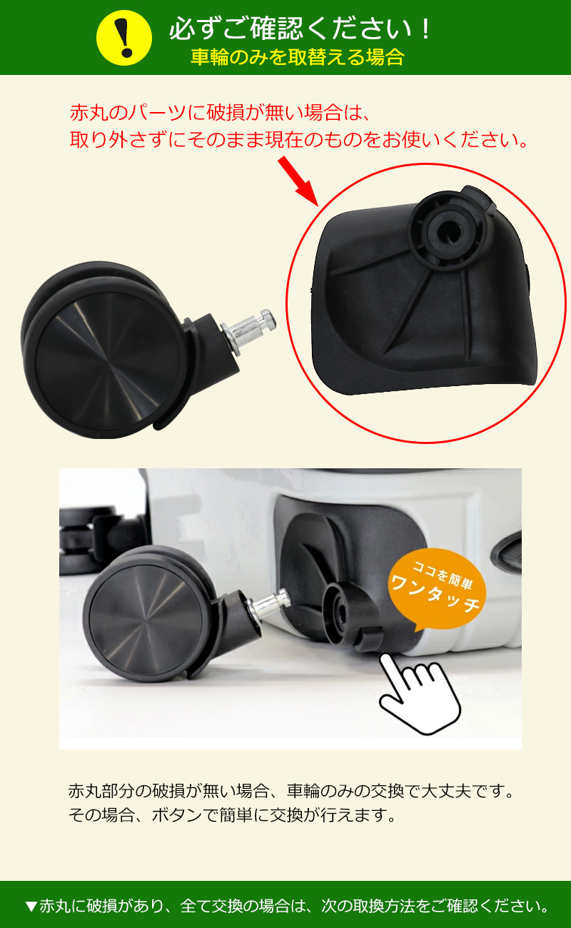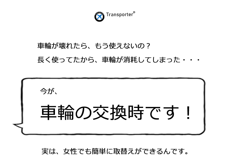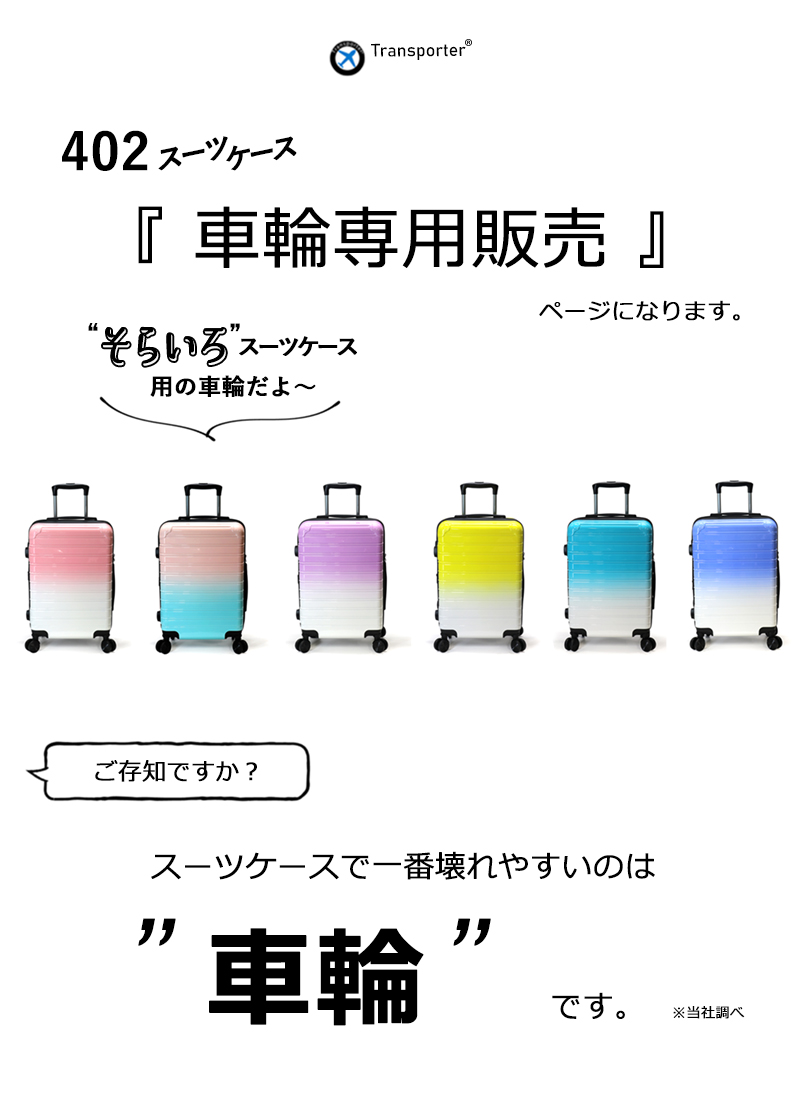 ●こちらのページは、ワンタッチで車輪が外せる!そらいろスーツケース専用の交換車輪の販売ページです。 スーツケースで一番壊れやすいのは〈車輪〉です。 車輪が壊れたら、もう使えないの?長く使っていたら、車輪が消耗してしまった! 「今が車輪の交換時です」 ページを見て頂いたらわかるように、女性の方でも簡単に取り換えが可能? 車輪が壊れた・すり減ってしまったからと言って、まだまだ使えるスーツケースを捨てるのはもったいないですよ! 新しい車輪に付け替えて、旅をもっと快適に? エードネットはサステナブルな活動を応援しています。 ※Sサイズ・Mサイズどちらも同じ車輪サイズになっています。 | ||||