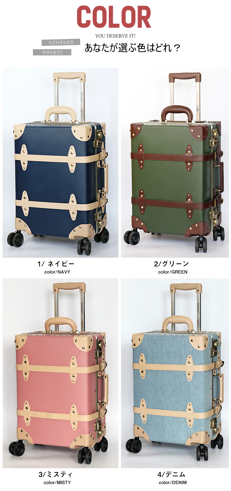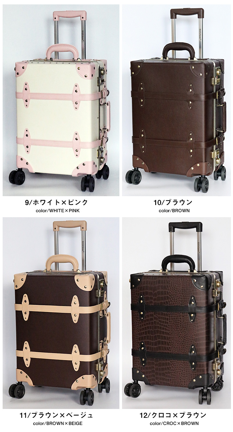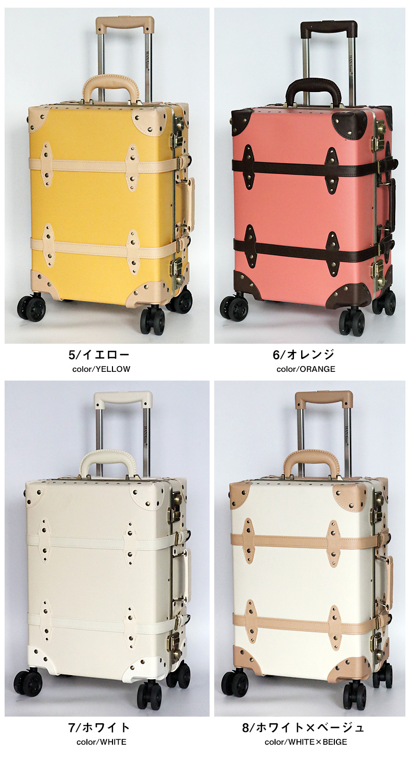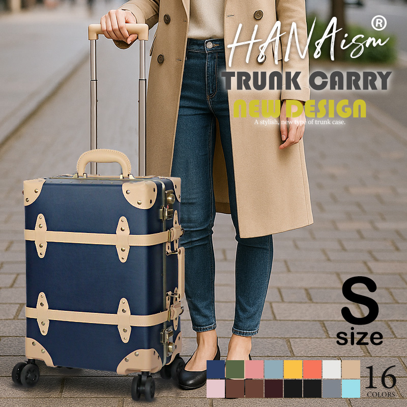 | アンティークな雰囲気と現代的な使いやすさを融合させた、 旅行やお出かけの楽しさをもっと特別なものにするため。 HANAism「視線を集める収納上手なトランクキャリー」が誕生。 ■クラシックなデザインと実用性を兼ね備えたトランク 【アルミフレームを採用し耐久性を向上】 このトランクキャリーは、ヴィンテージ感あふれるアンティークデザインが特徴でありながら、従来モデルよりも強度を向上させた上位機種です。 アルミフレームを採用し、耐久性を高めることで、旅の途中でも大切な荷物をしっかり守ります。 さらに、従来のトランクでは収納が難しかった蓋部分にもスペースを確保し、より多くの荷物を整理しやすい構造になりました。 【世界基準のTSAロックを搭載】 アメリカ領土への渡航時、手荷物または受入れ荷物は。一切の施錠をしないのが原則となっております。 施錠された荷物については鍵機構を破壊する事が認められており、破壊されたり盗難にあっても補償は一切ないのが現状です。 そこで便利な機能がTSAロック。このロック機能を使用すれば荷物を施錠して航空会社に預け入れしていただけます。 万が一、荷物の検査が必要になった場合は、専用のスペシャルツールで解錠・検査しますので、鍵機構を破壊される事がありません。荷物を施錠せずに渡すというリスクを負う事なく、安心して海外にでることができるロック機能がTSAロックです。 【シーンによって長さを使い分け。多段階キャリーバー】 スーツケースで多用する部分だからこそ拘りを。親指でプッシュするだけの、簡単操作で簡単にキャリーバーを引出す事が出来るので、片手がふさがった状態でもストレスなくお使い頂けます。 また交通機関をご利用するなどシーンに合わせて多段階調節が出来るのもうれしいですね。 またキャリーバーにはブランドロゴが刻まれ、細部までこだわり抜かれたキャリーです。 【清潔感のある内装デザイン】 内装にはストライプ柄をあしらい、開けた瞬間にも可愛らしさを演出。 荷崩れ防止ベルトやデザイン性の高いベルトを採用し、使いやすさも向上させています。 留め具は引っかけるタイプになっているので、仕切り自体を取り外す事も可能です。 【長く愛用して頂ける素材】 表面素材は、撥水性に優れ汚れに強い。PP+PVCを採用。※カラー4/デニムのみ、デニム生地となります。 またダメージの受けやすい四隅には、デザイン性のあるコーナープロテクトを。 荷物を開け閉めする際に地面に当たる部分に金具を施す事で、長く綺麗にスーツケースの状態を保つことができます。 【スムーズに動く。安定のダブルホイール】 スーツケースを倒さずに水平移動ができ、キレイにまとめた荷物の片寄りを軽減。安定したダブルホイールは360°回転してくれるので、人混みの中でもスムーズな動きで快適な旅がお楽しみいただけます。 国際線・国内線(100席以上)の機内に持ち込むことができる幅55cm×高さ40cm×奥行25cm以内に 適合したサイズとなっております。搭乗時や到着後の移動がスムーズにでき、 荷物を預けることがちょっと不安と感じる方におすすめです。 ※LCC・MCCを除く航空会社で機内持ち込みしていただけます。 また路線、飛行機の種類により機内に持ち込む事が出来ない場合がございますので、予めご了承願います。 | |