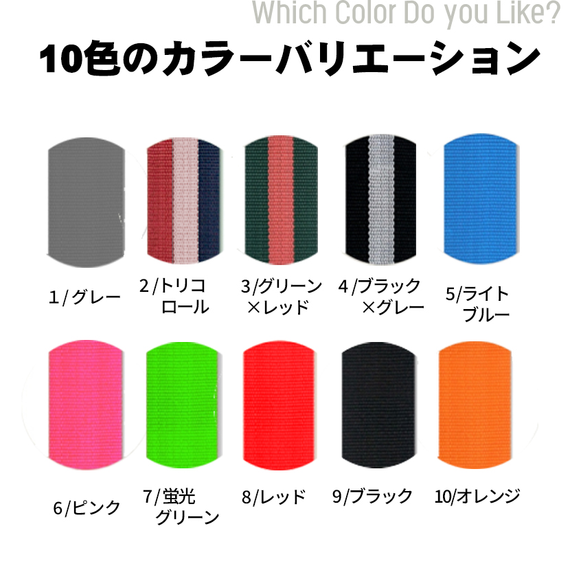 | カラー | 1グレー、2/トリコロール、3/グリーン×レッド、4/ブラック×グレー、5/ライトブルー、6/ピンク、7/蛍光グリーン、8/レッド、9/ブラック、10/オレンジ |
