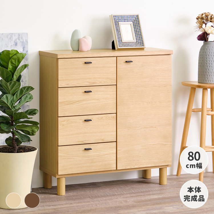 オススメポイント シンプルなデザインの中に優しい雰囲気を醸し出す北欧デザインのリビングチェスト。前板に天然木突板を使用したので木の風合いを存分に楽しめます。左側には安全に考慮してストッパーを設置した4杯の引き出しを。右側の扉収納内は収納するものに合わせて自由に調節することができる可動式の棚板付き。背面には配線を誘導できるコード孔が開いているため、ルーターやWi-Fiの配線もすっきりさせて収納可能。脚付き構造で掃除もしやすく、お掃除ロボットも通過できるのでいつでも清潔に保つことができます。
