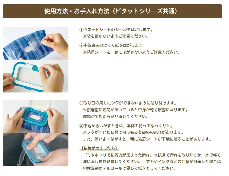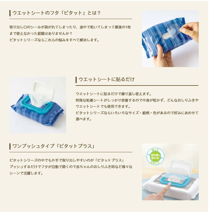 ・おしりふきやお手拭き汗拭きシートなど貼ってはがして何回でも繰り返し使える