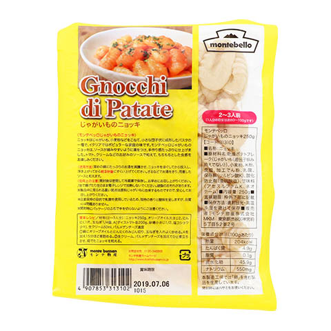 | 米粉配合で手作りのニョッキを思わせる、もちもち食感が魅力のじゃがいものニョッキ。 ニョッキとは小麦粉などをこねて、小さな団子のような形に手作りするパスタの一種です。 ソースが絡みやすいように溝がつけられているのが特徴で、沸騰させた湯で茹でて、トマトやクリームなどのお好みのソースで和えてお召し上がりください。(国内加工) |