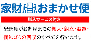 | 【備 考】 | ・こちらの商品は搬入サービス付きです ・商品のお部屋までの搬入・開梱・組立・設置・梱包ゴミの回収、すべてを行います。 ・2F以上の設置の場合は搬入経路を必ずご確認ください ・階段からの搬入が出来ない場合は、 吊上げ・クレーン作業が必要な場合があります その場合、別途費用が現地にて発生します ・配送日指定できます(最長3ヶ月程度です) ・家具の組立方法 ・よくある質問 |