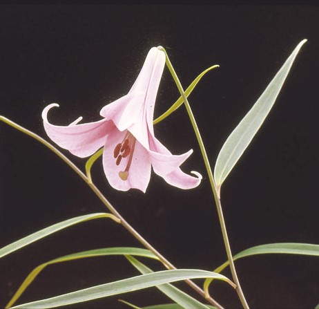 「ジンリョウユリ」は、徳島県神領(じんりょう)で発見されたササユリの変異種。蛇紋岩地帯に自生するため矮性で、花のつけ根の喉の部分は濃桃色。