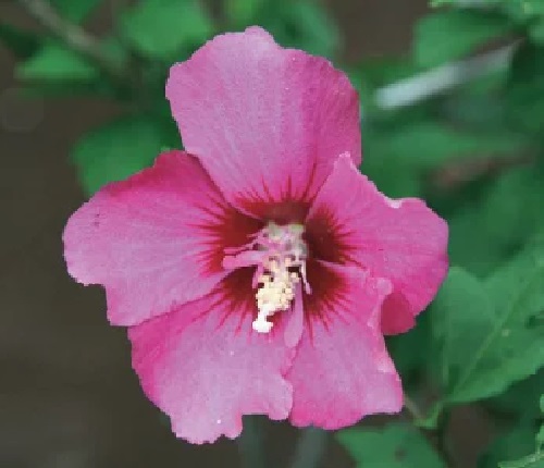 「ムクゲ 赤祇園守」は、花柱の基部の花粉袋が花弁化した半八重咲きの紅花品種。花笠タイプより花弁数は少なく、30枚以下。