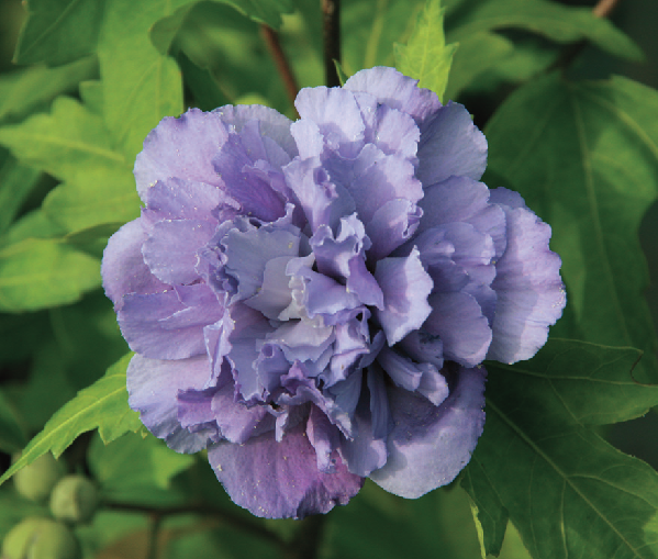 「ムクゲ 紫玉」は、江戸時代から知られる古品種。青色の八重咲きで、内弁と外弁はともに短く、花形は球形。
