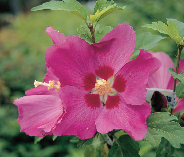 「ムクゲ ウッドブリッジ」は、英国で交配された一重咲き品種。ローズピンクの一重咲きで花底にエンジ色のブロッチが入る大輪。花径10cm前後。