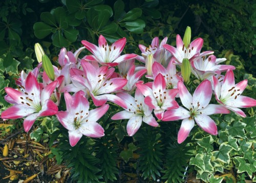 「ユリ シュガーラブ」は、白色の花弁の先端にラベンダーピンクの斑紋が入るバイカラー咲きのアジアティックリリー。
