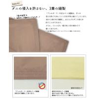 アレルガードの布団カバーの縫製は、ダニの侵入を防ぐためにミシン目を非常に細かくしています。通常の1.5倍の細かさで縫ってあります。ミシン掛けは表側から三重に縫製し、ほとんどのダニの侵入を防ぐことができます。(裏側など)生地の継ぎ目はインターロックミシンで縫っています。