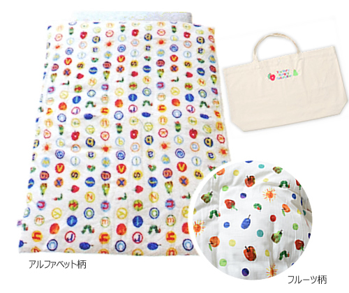 絵本に登場するあおむしや果物のモチーフをそのまま散りばめた、色鮮やかでキュートなお布団です。