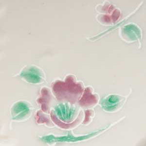 花の絵柄の輪郭部分を盛り上げ厚みのある線と、中側には色々の絵具を配色した転写紙です。