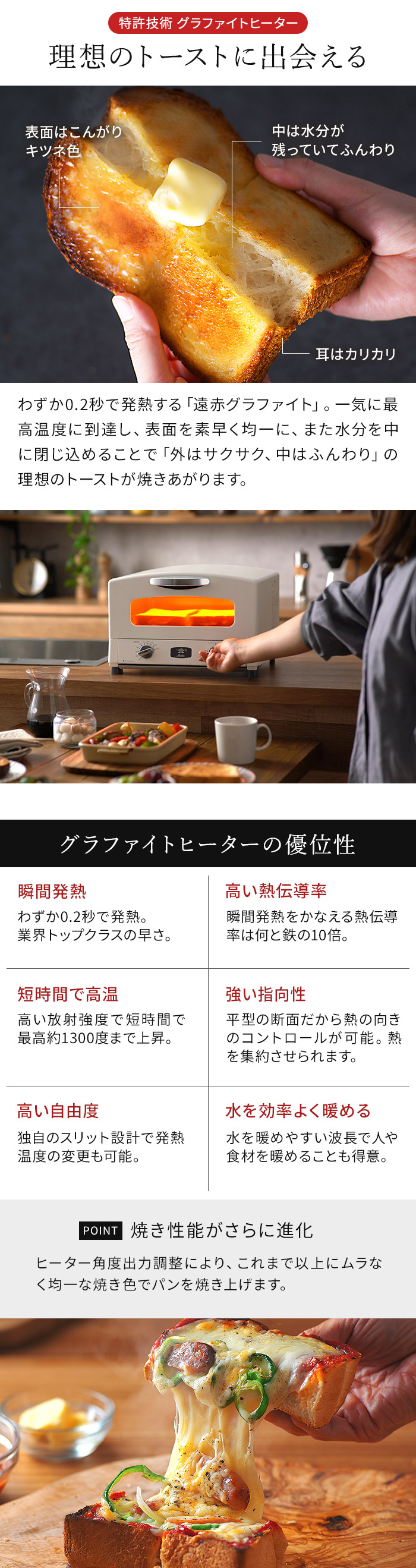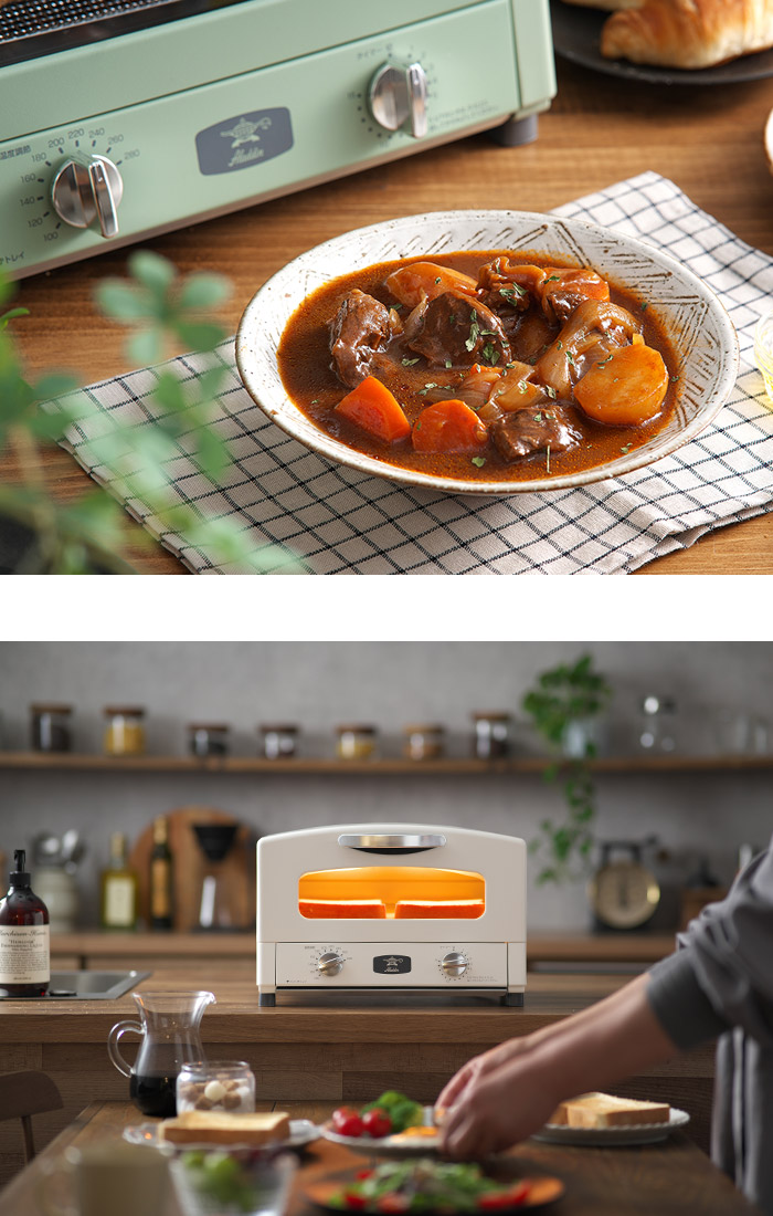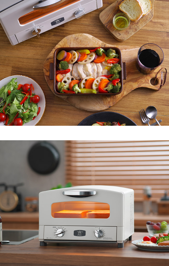 | スタッフコメント 余熱なしでもおいしく素早く焼き上げるトースター 本場イタリアのピザ窯のように、高温の庫内で一気に香ばしく焼き上げる「アラジン グラファイト トースター」。ハイパワーかつ短時間で表面を焼き上げ内部の水分を逃がさないため、「外はサクッと、中はモチっと」したトーストが時短で焼けます。 コンパクトで山型の食パンが2枚焼きができます。1〜2人分の朝食作りやお弁当のおかずを調理するのにぴったり。アラジンらしいレトロな美しさと飽きのこないおしゃれなデザインも魅力です。 | |