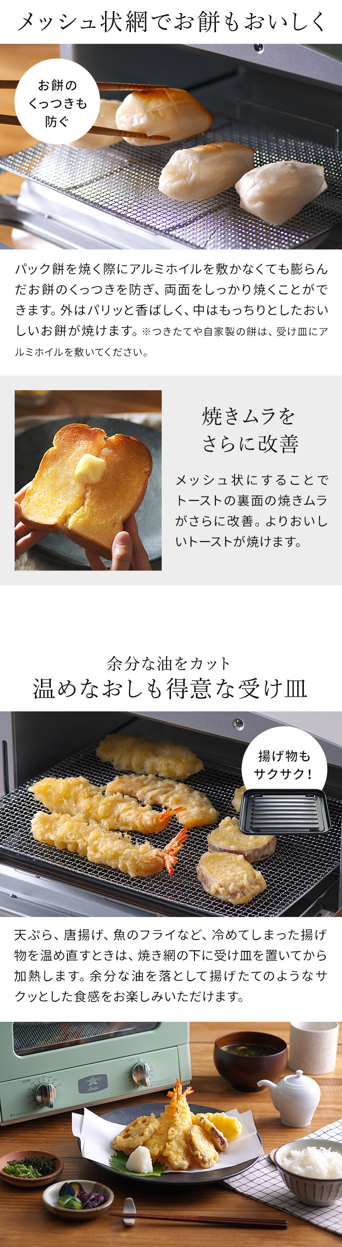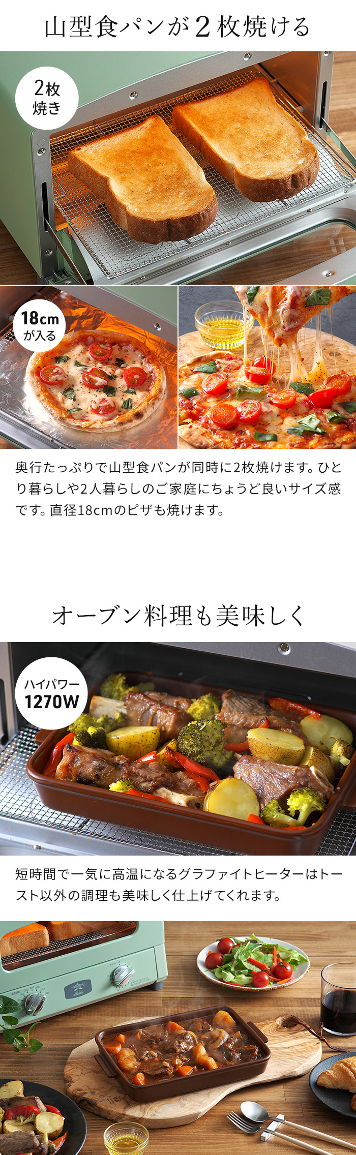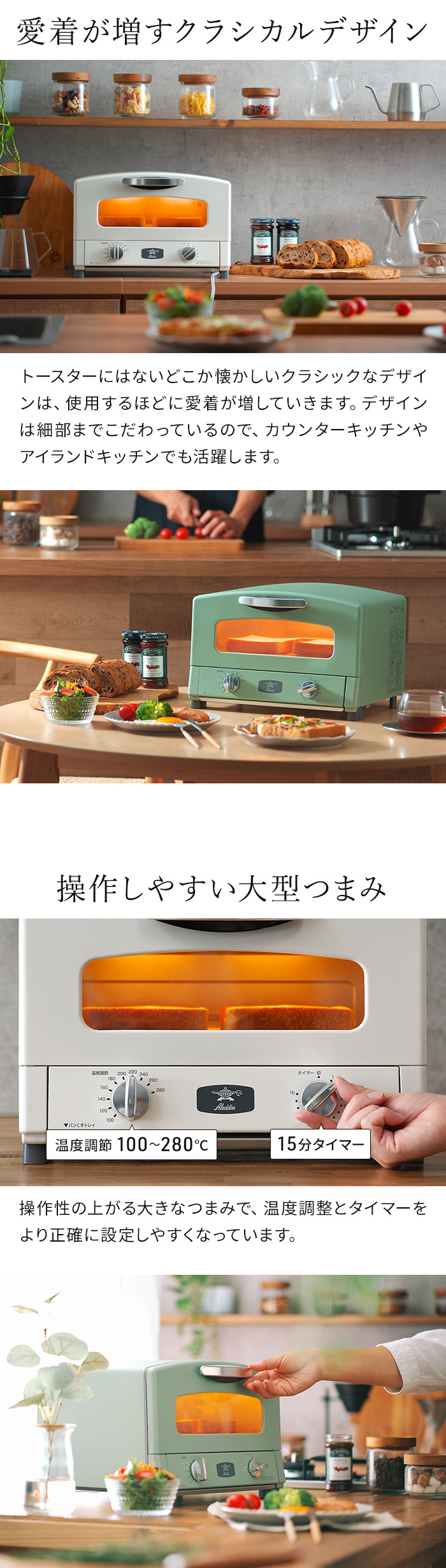 | スタッフコメント 余熱なしでもおいしく素早く焼き上げるトースター 本場イタリアのピザ窯のように、高温の庫内で一気に香ばしく焼き上げる「アラジン グラファイト トースター」。ハイパワーかつ短時間で表面を焼き上げ内部の水分を逃がさないため、「外はサクッと、中はモチっと」したトーストが時短で焼けます。 コンパクトで山型の食パンが2枚焼きができます。1〜2人分の朝食作りやお弁当のおかずを調理するのにぴったり。アラジンらしいレトロな美しさと飽きのこないおしゃれなデザインも魅力です。 | |