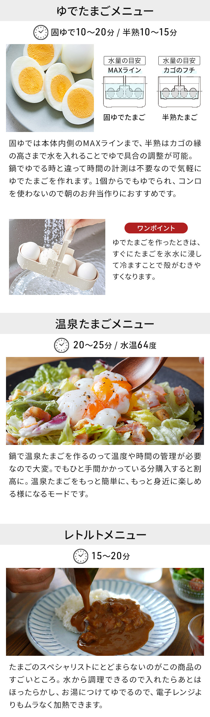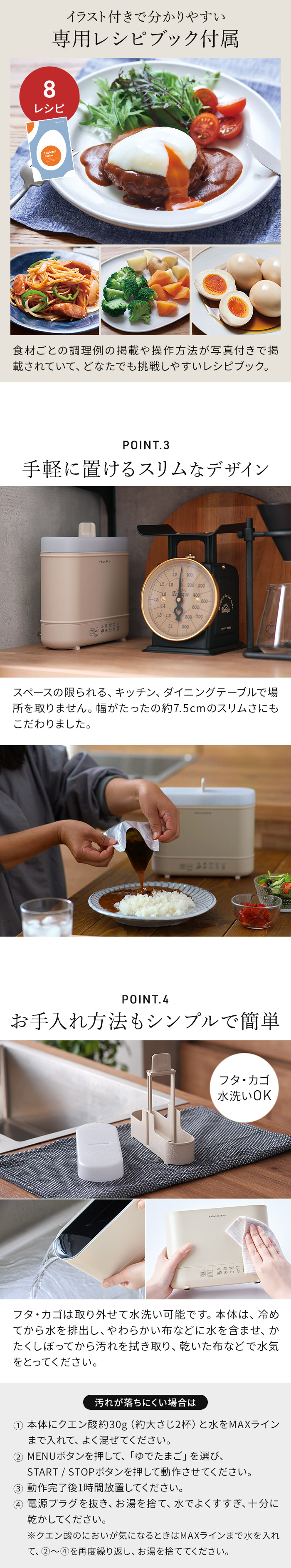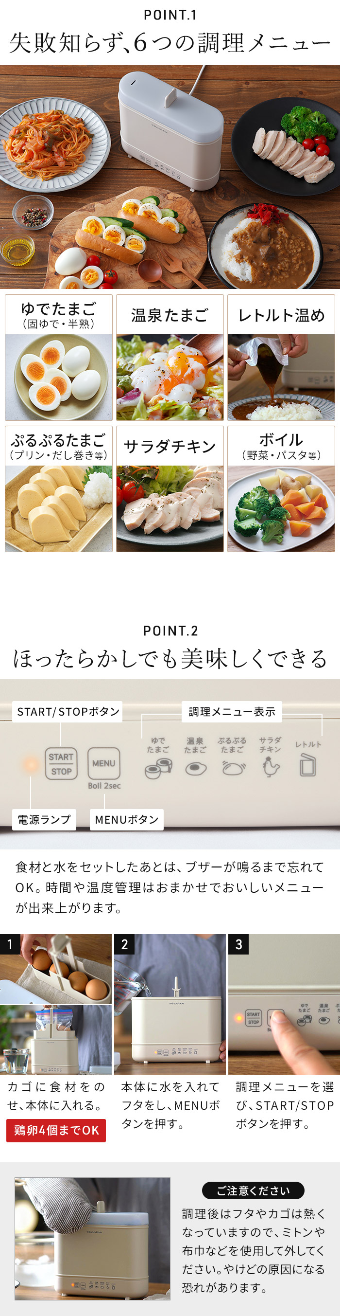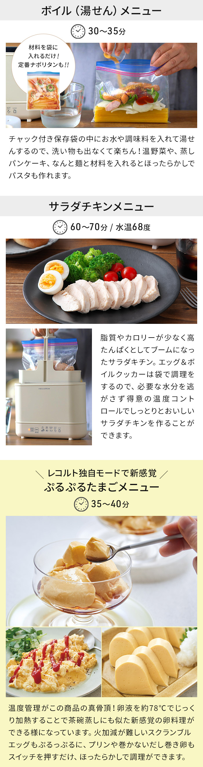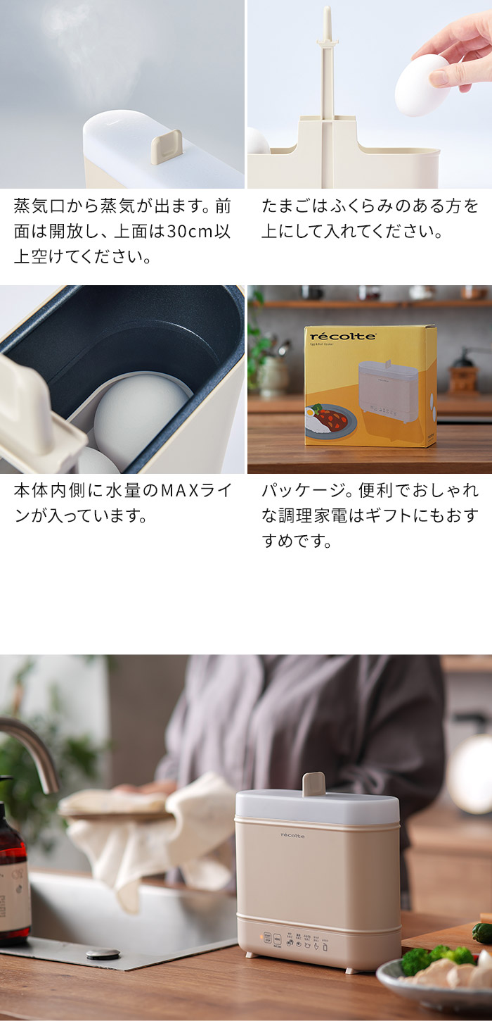 | キーワード ゆでたまごメーカー ゆで卵 茹でタマゴ 卵 メーカー サラダチキンメーカー 温泉卵 温泉たまご 半熟 固ゆで エッグ ボイル レトルト温め プリン 出し巻き 蒸しパン パスタ 野菜 温野菜 ヘルシー お弁当 時短 1台6役 ヘルシー ダイエット 高タンパク質メニュー 全自動 茹で器 茹で機 電気 自動 ほったらかし 簡単 便利 スリム コンパクト recolte レコルト エッグ&ボイルクッカー REB-1 | |