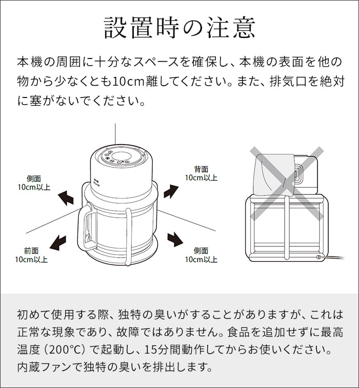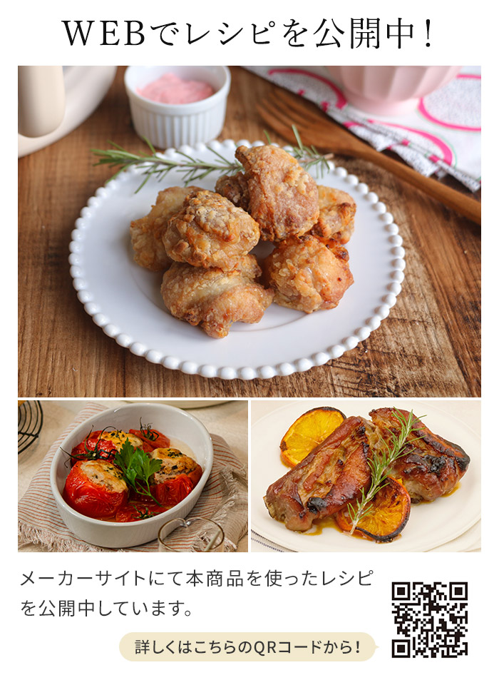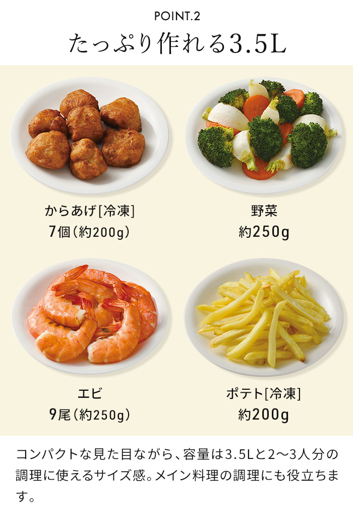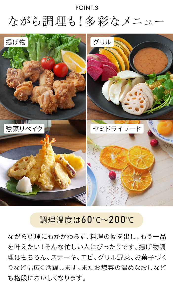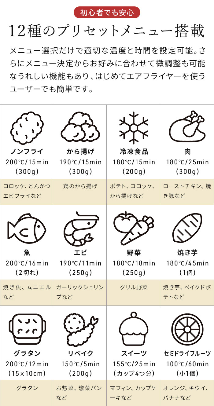 | 機能 | 温度調節:60〜200℃ 時間調節:1〜60分 プリセットメニュー機能:12メニュー(ノンフライ / から揚げ / 冷凍食品 / 肉 / 魚 / エビ / 野菜 / 焼き芋 / グラタン / リベイク / スイーツ / セミドライフルーツ) |