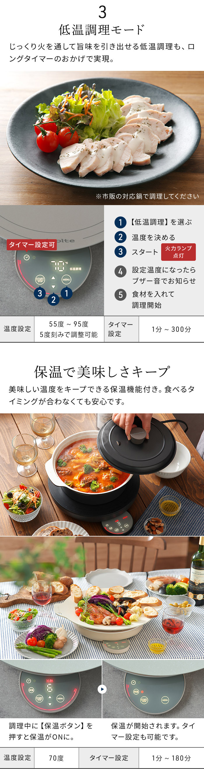 | 機能 | 加熱モード:1〜7段階(180〜1200W)デフォルトは「6」1,000W ※「7」は10分間のみ動作可能(自動で6になります。消費電力が高く、急加熱となるため) 揚げモード:140度〜200度まで5度刻みで調整可能、デフォルトは160度 低温調理モード:55度〜95度まで5度刻みで調整可能、デフォルトは70度 保温モード:70度(固定) |