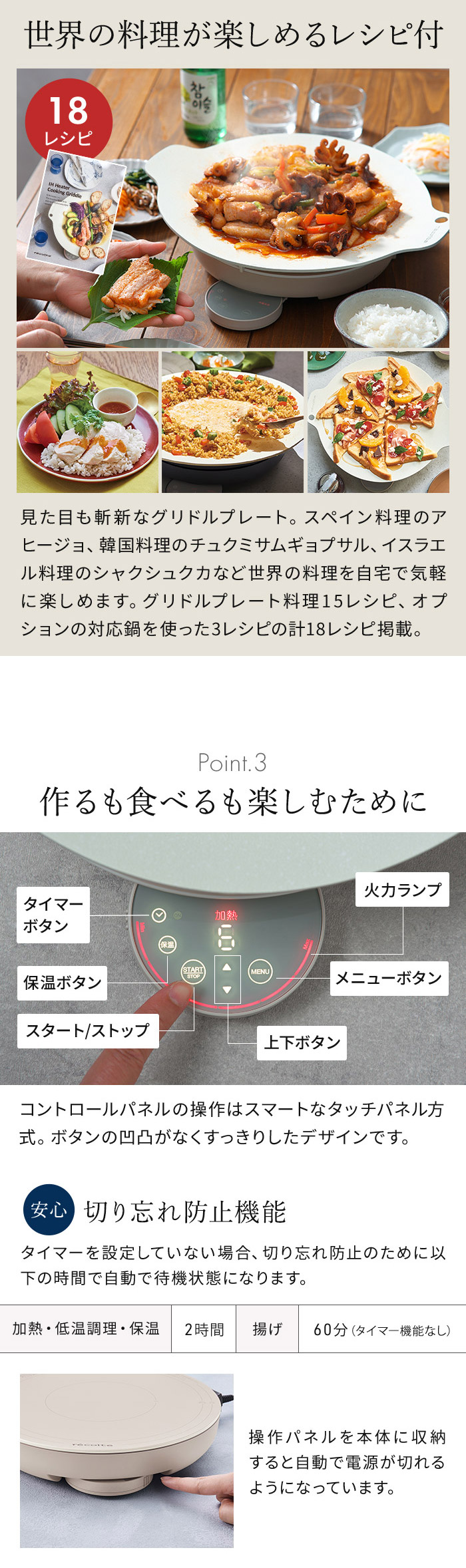 | スタッフコメント 四角型IHが主流な中、今までにない円形フォルムが新しいテーブルクッキングのスタイルを生み出します。卓上IHクッキンググリドルから、待望のIHヒーター単品販売をスタート。7段階で調整できる「加熱」モードの他に、「揚げ」「低温調理」「保温」のメニューを搭載。コントローラーが本体に格納され、使用時のみ出して使えるスマートなデザインです。火を使わないので、火事の心配がなく、ふきこぼれても拭くだけの簡単なお手入れでOKです。また、自立できるスタンド付きで、縦置き収納ができ収納も省スペースでスマートに。 | |