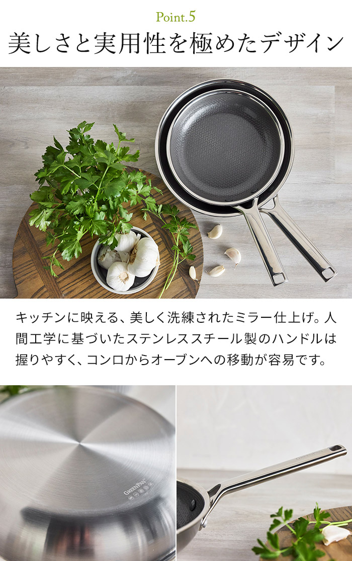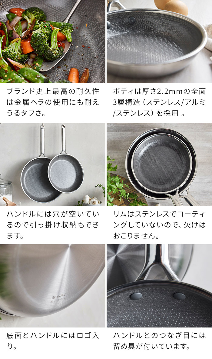 | スタッフコメント 次世代のテクノロジーを搭載し、ステンレスとセラミックのハイブリッド技術を搭載したコレクション「APEX(エーペックス)」。優れた焼き付けと焼き色を実現するエッチングパターン、2層構造のセラミックノンスティックコーティングを採用。表面全体にクリアトップコートを重ねています。サーモロン史上最高のコーティングで高い耐久性を実現。新技術「サーモボンドテクノロジー」のおかげで、驚くほど簡単な洗浄・お手入れが実現しました。食器洗浄乾燥機にも対応しています。PFASフリーで安心で無害なのもグリーンパンの特長です。 | |