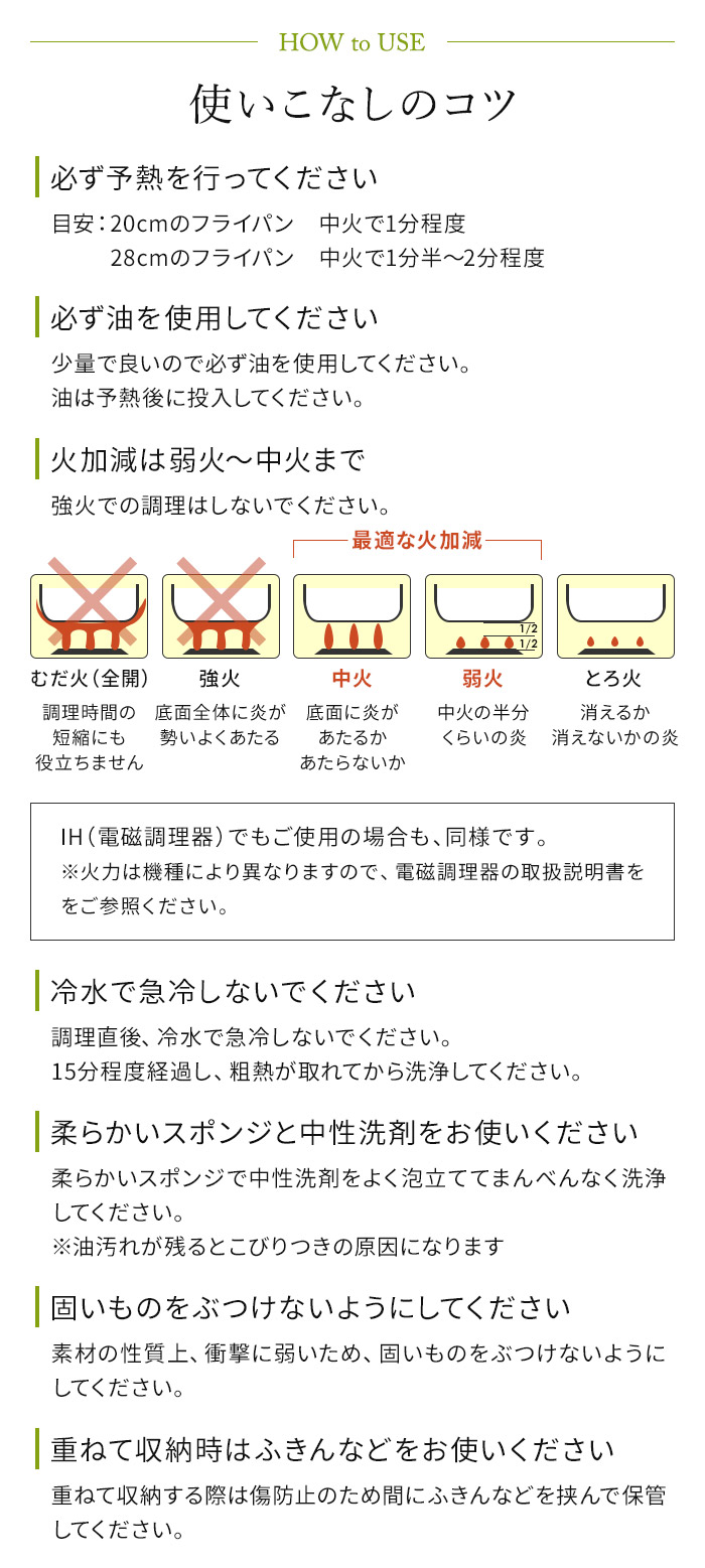 | サイズ / 重量 | 20cm: 全長37.7cm × 横幅21.6cm × 高さ7.5cm / 705g 24cm:全長43.2cm × 横幅25.6cm × 高さ7.8cm / 911g 26cm:全長47.2cm × 横幅27.6cm × 高さ8.3cm / 1,010g 28cm:全長49.3cm × 横幅28.6cm × 高さ8.6cm / 1,148g ウォックパン28cm:全長49.6cm × 横幅29.6cm × 高さ11.2cm / 1,214g |