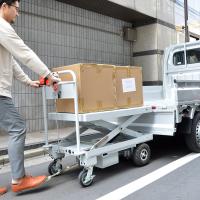 ●重い荷物を載せても、電動の力で楽に運搬できる電動アシスト台車。その電動台車に、油圧式の昇降リフトがつきました。