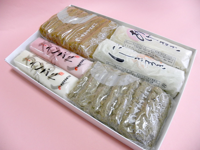 じゃこ天10枚、中村てんぷら7枚、かまぼこ うしおに紅白各1本、それにあげまき、にしき巻きをお詰め合わせにしました。
