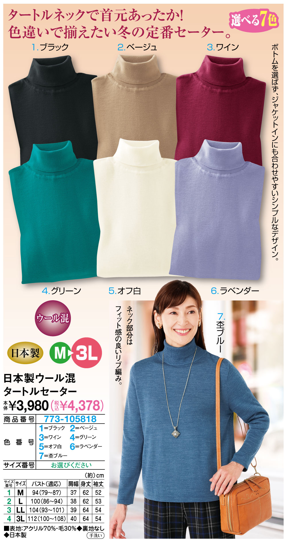 日本製ウール混タートルセーター オフ白 グリーン ブラック ベージュ ラベンダー ワイン 杢ブルー M L LL 3L