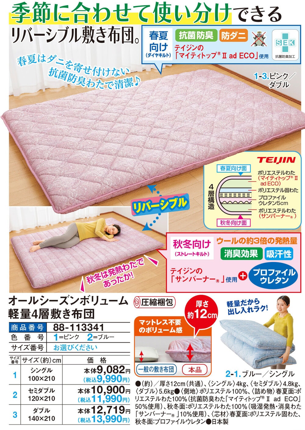 ●<側地>ポリエステル100%、<詰め物>春夏面:ポリエステルわた100%(抗菌防臭わた「マイティトップ(R)II ad ECO」50%使用)、秋冬面:ポリエステルわた100%(吸湿発熱・消臭わた「サンバーナー(R)」10%使用)、<芯材>春夏面:ポリエステル固わた、秋冬面:プロファイルウレタン