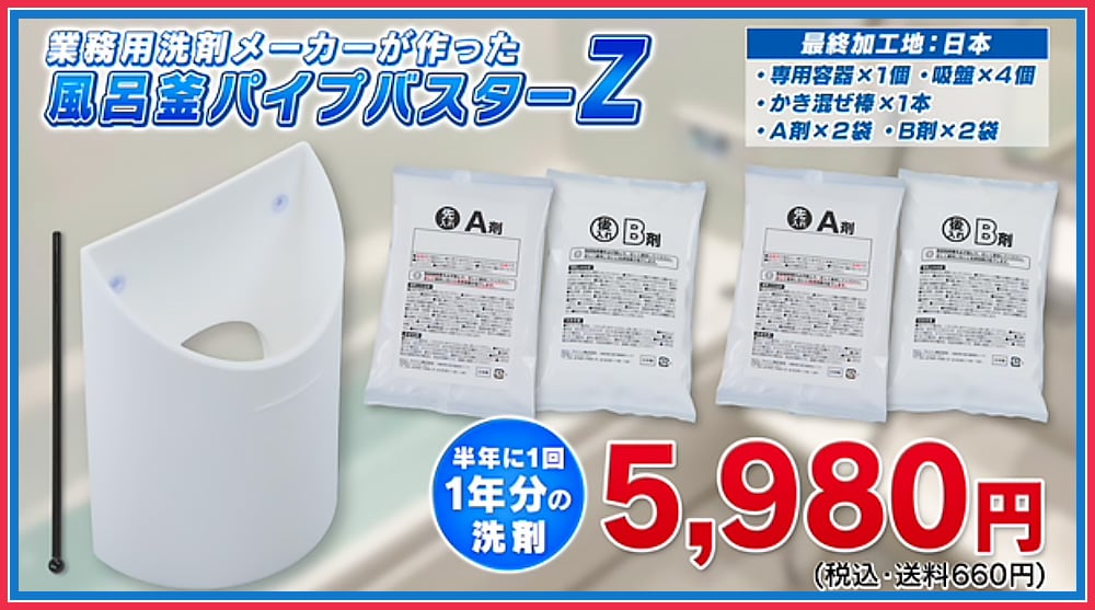 <風呂釜パイプバスターZ>A剤2袋、B剤2袋、洗浄カップ、吸盤4個、かき混ぜ棒