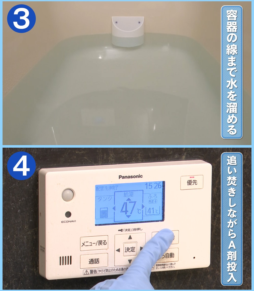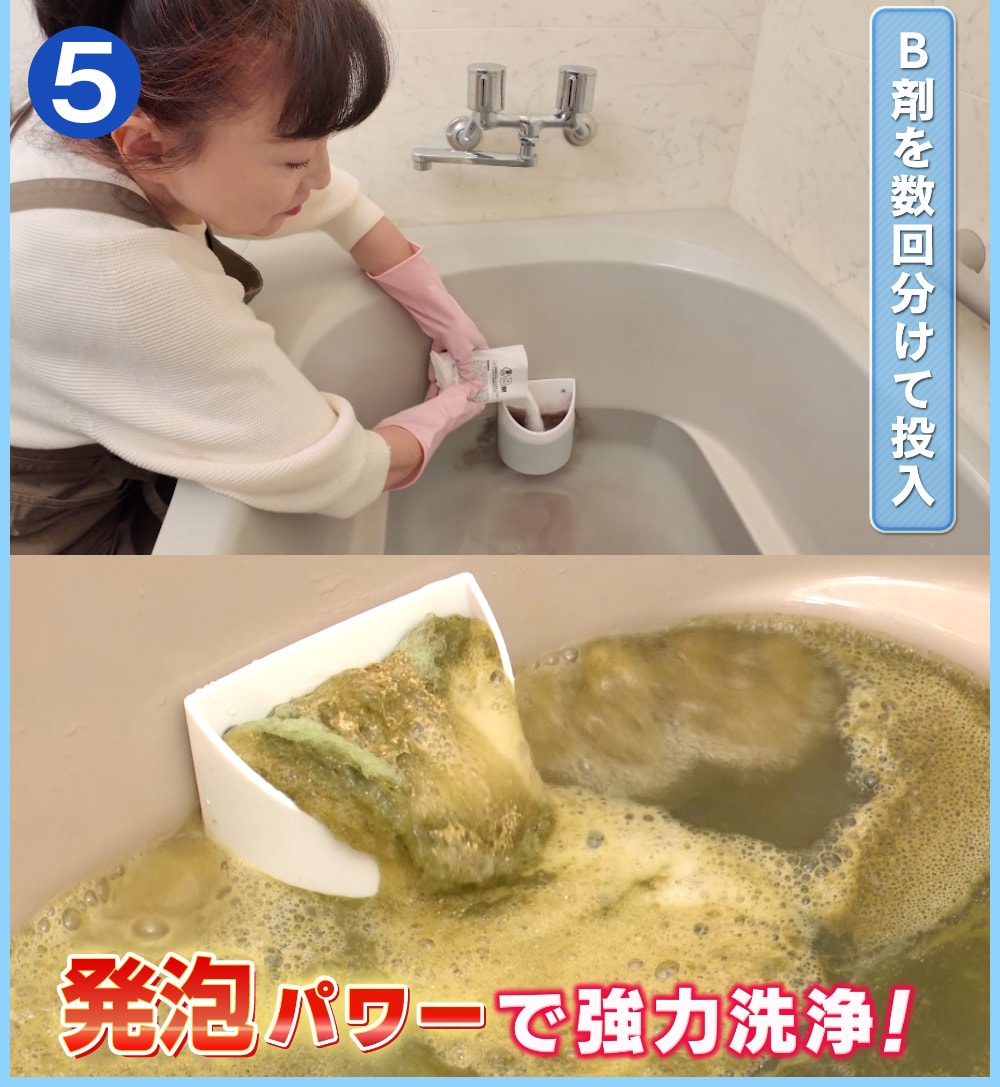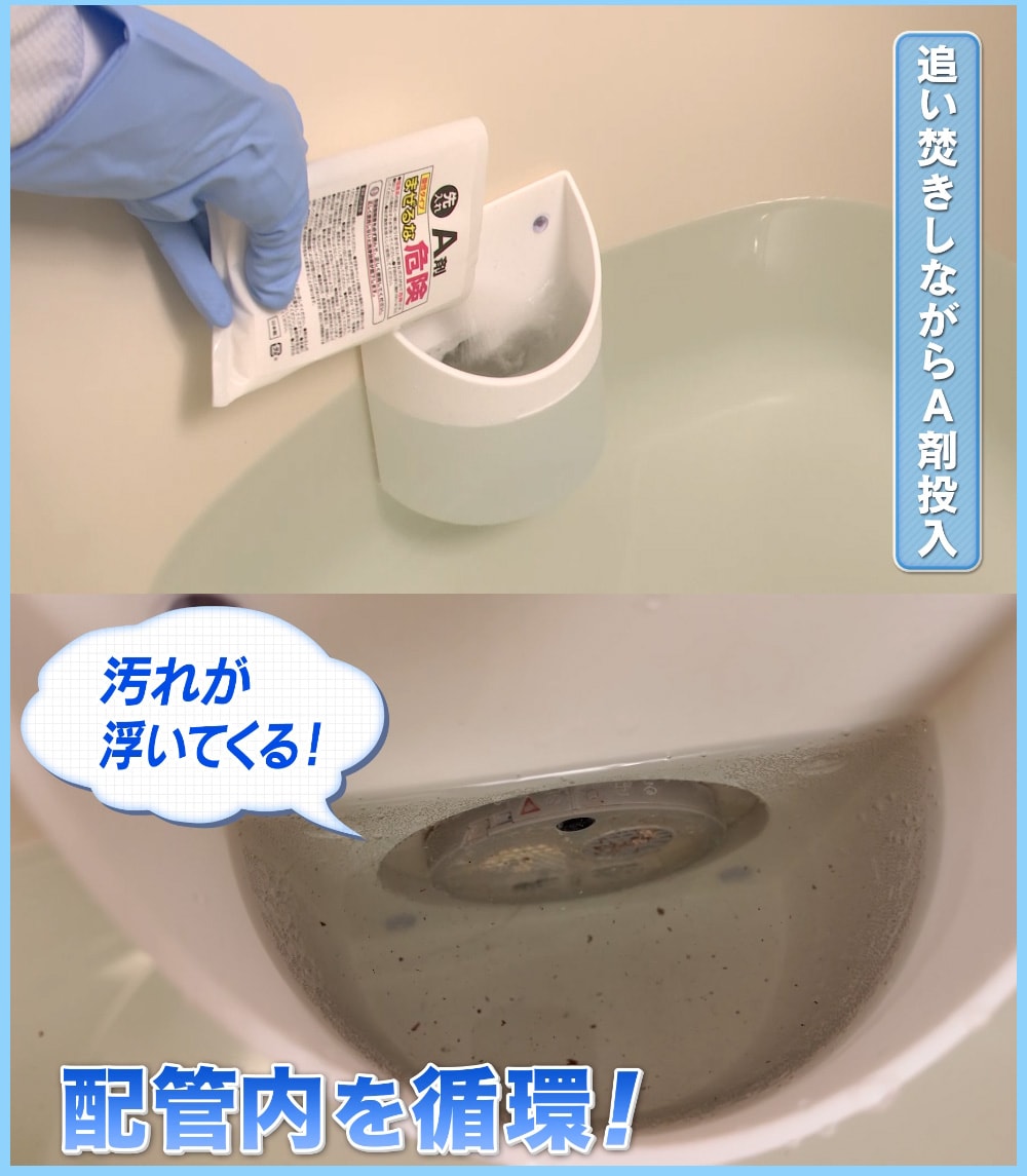 <排水口洗浄剤>A剤:スルファミン酸、B剤:過炭酸ナトリウム・炭酸ナトリウム・炭酸水素ナトリウム・発砲促進剤・抗菌剤(銀イオン)・防錆剤※使用できないお風呂のタイプ