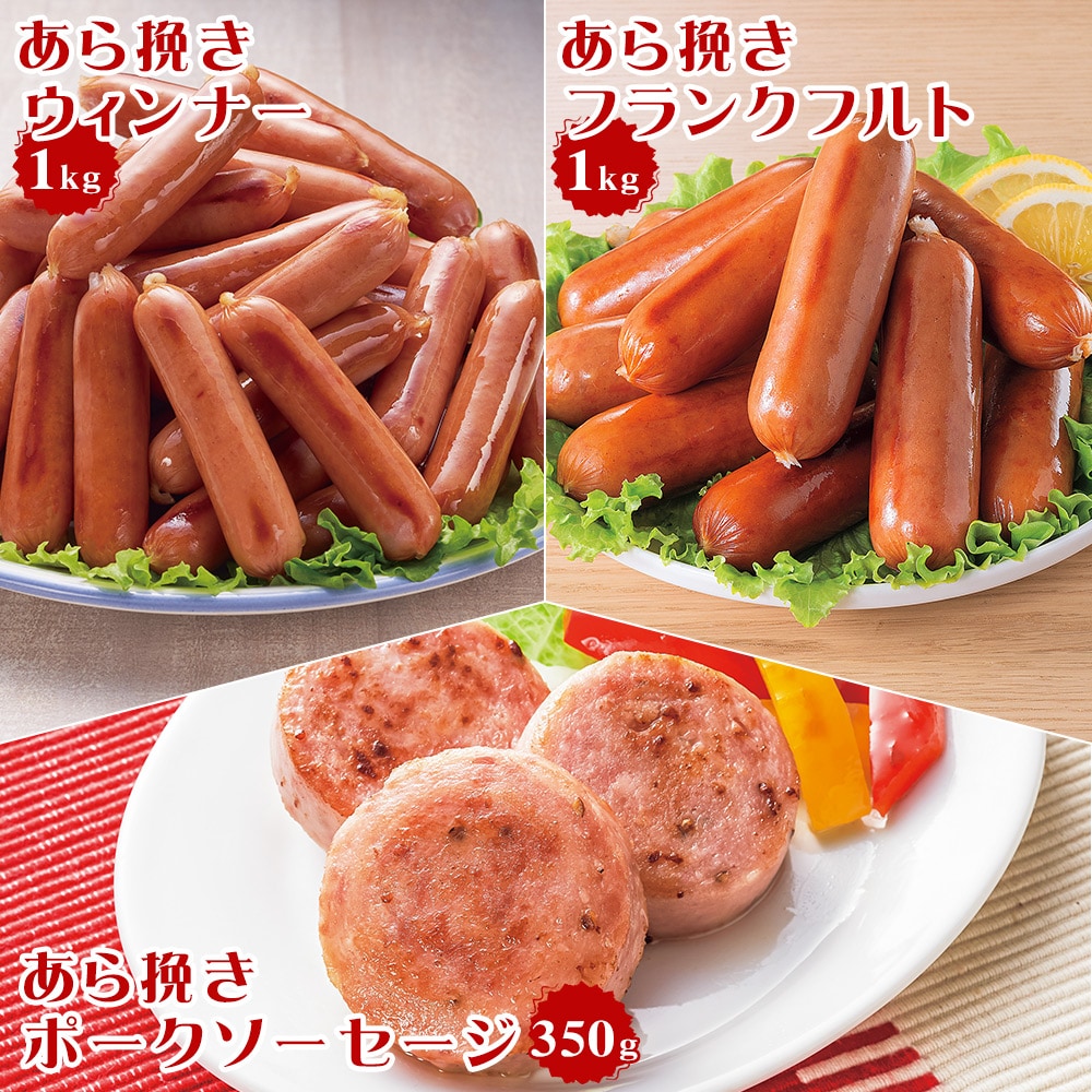 ●セット内容/<あら挽きウインナー>1kg×1袋<あら挽きフランクフルト>1kg×1袋<あら挽きポークソーセージ>350g×1本