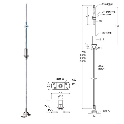 天井吊り棒(高さ調整・ロック機構付) 座金タイプ CBD-SBLS-750 750mm