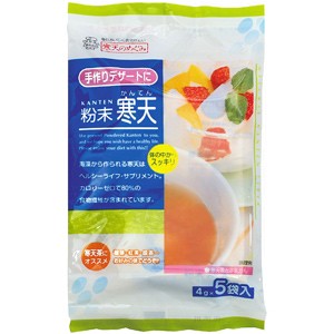 粉末寒天4gで角寒天約1本分、本品1袋(20g)で角寒天約5本分に相当。水戻しや裏ごしが不要。デザートや料理にお使い下さい。