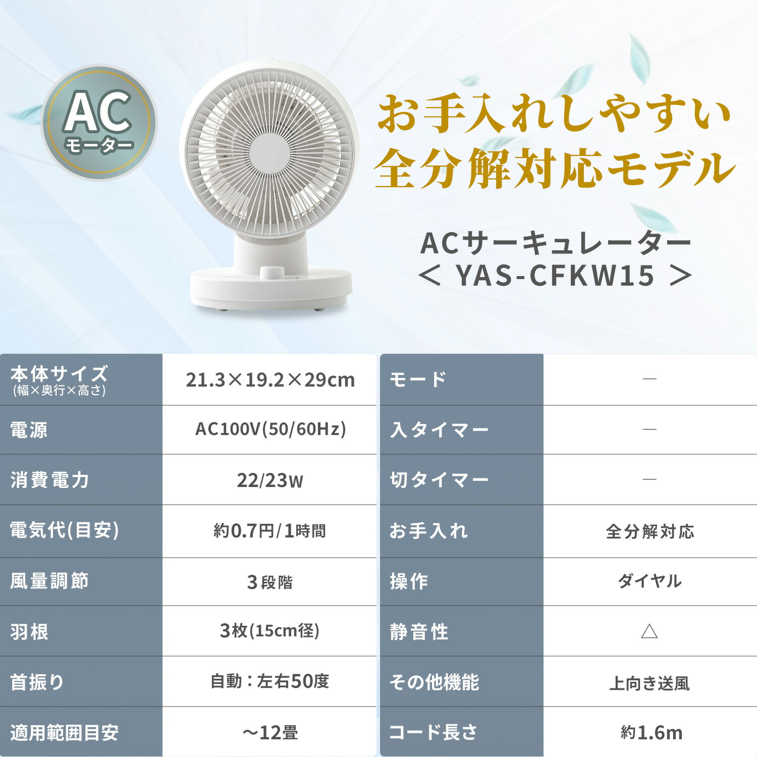 サーキュレーター 静音 扇風機 洗える 山善 洗えるサーキュレーター 全分解 左右首振り 風量3段階 12畳まで YAS-CFKW15 90度上向き