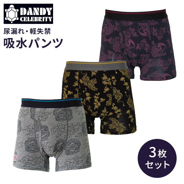 尿漏れ 軽失禁 吸水パンツ スマートボクサーパンツ 和柄プリント 3枚組 (M/L/LL/3L) SPMMOK-136GA グレー/ブラック/ネイビー 失禁パンツ メンズ 紳士 男性用