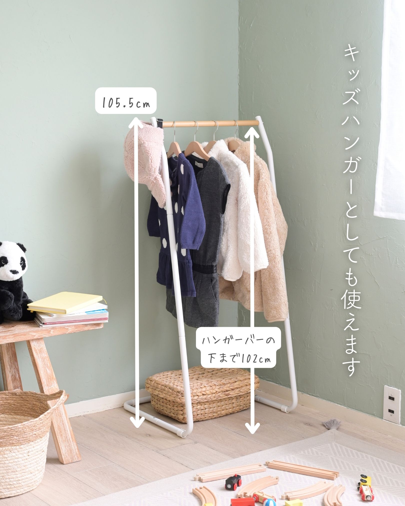 ●キッズハンガー時のサイズ: 高さ約105.5cm、床からハンガーパイプ上まで104、下まで102cm