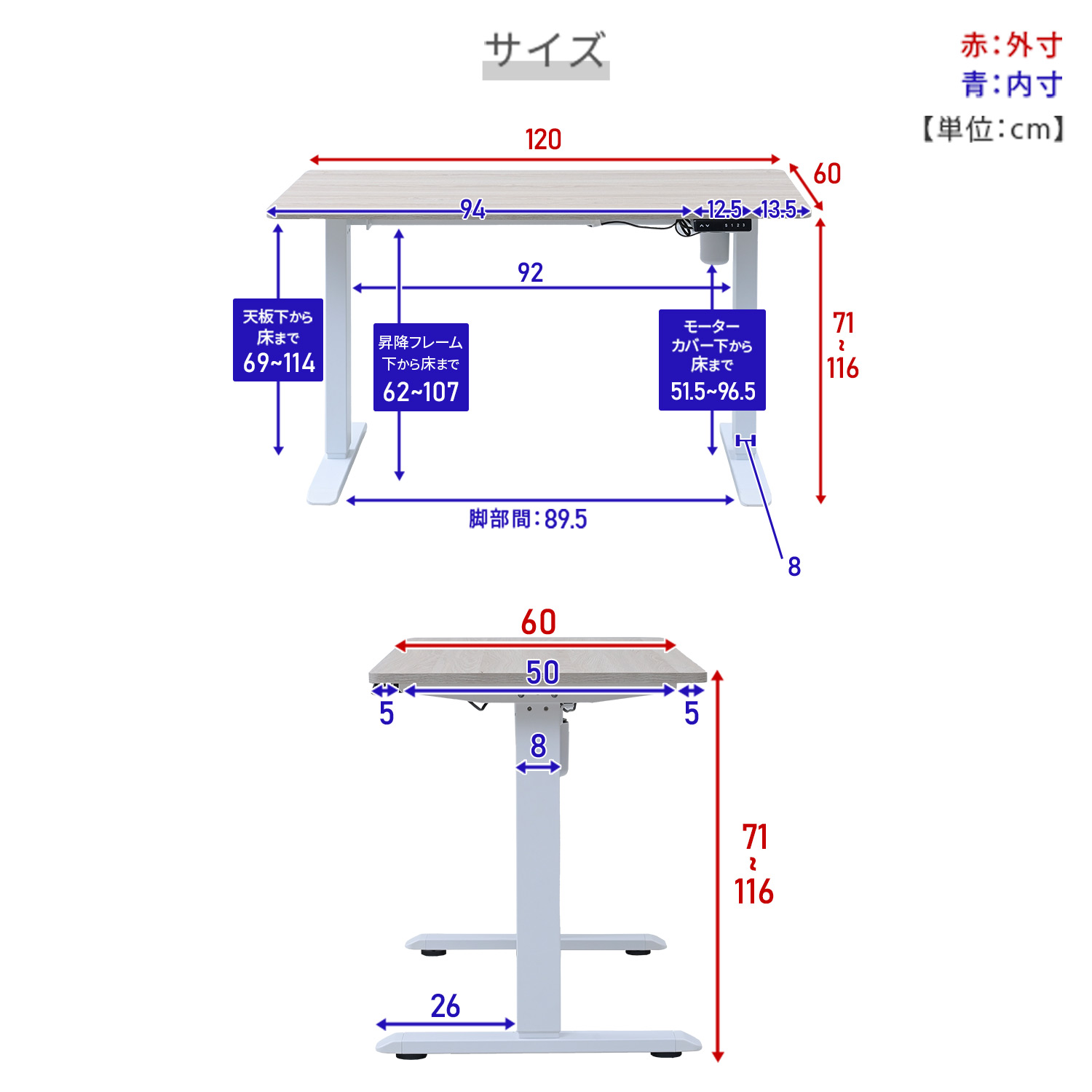 電動 昇降デスク 幅120 奥行60 高さ71-116cm メモリー機能付き