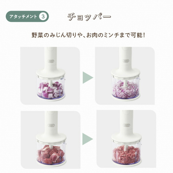 ●アタッチメントを付け替えれば、「混ぜる」「刻む」「潰す」「泡立てる」などの調理が可能
