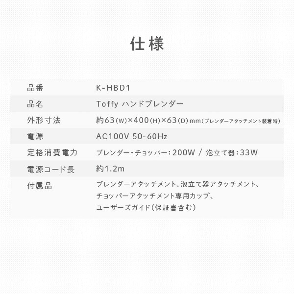 ●定格消費電力:200W(ブレンダー・チョッパー)/33W(泡だて器)