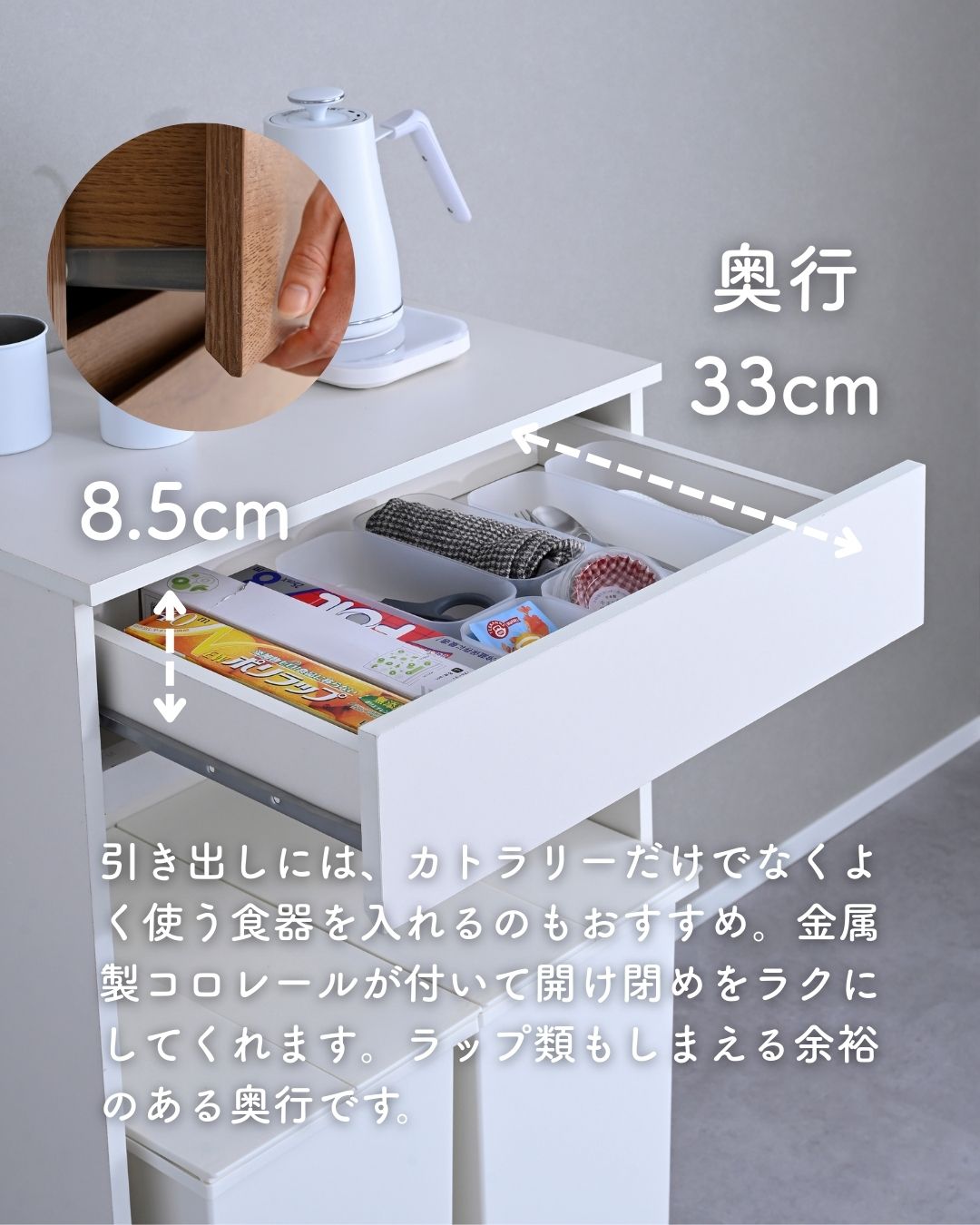 ●引き出しには、開け閉めをラクにする金属製コロレール付き