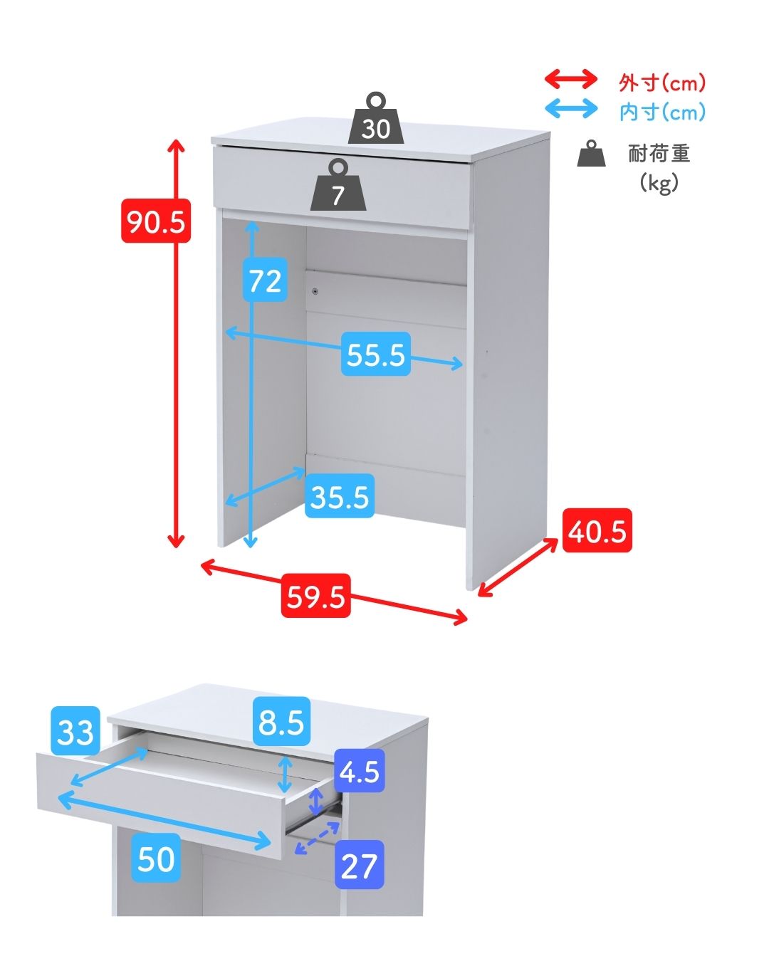 ●耐荷重: 天板30kg、引き出し7、全体37kg