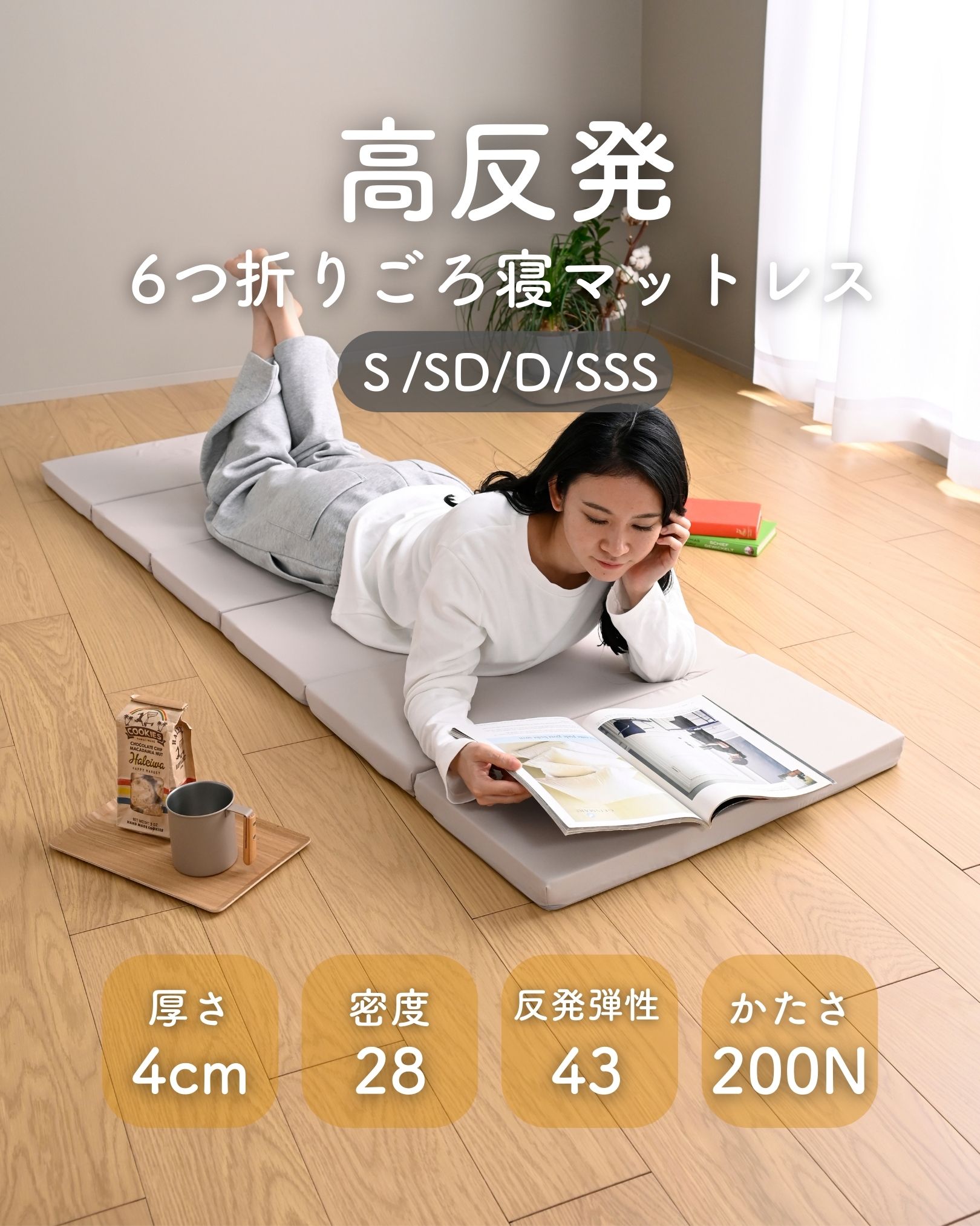 ごろ寝 マットレス 6つ折り かため 軽量 高反発 厚さ4cm