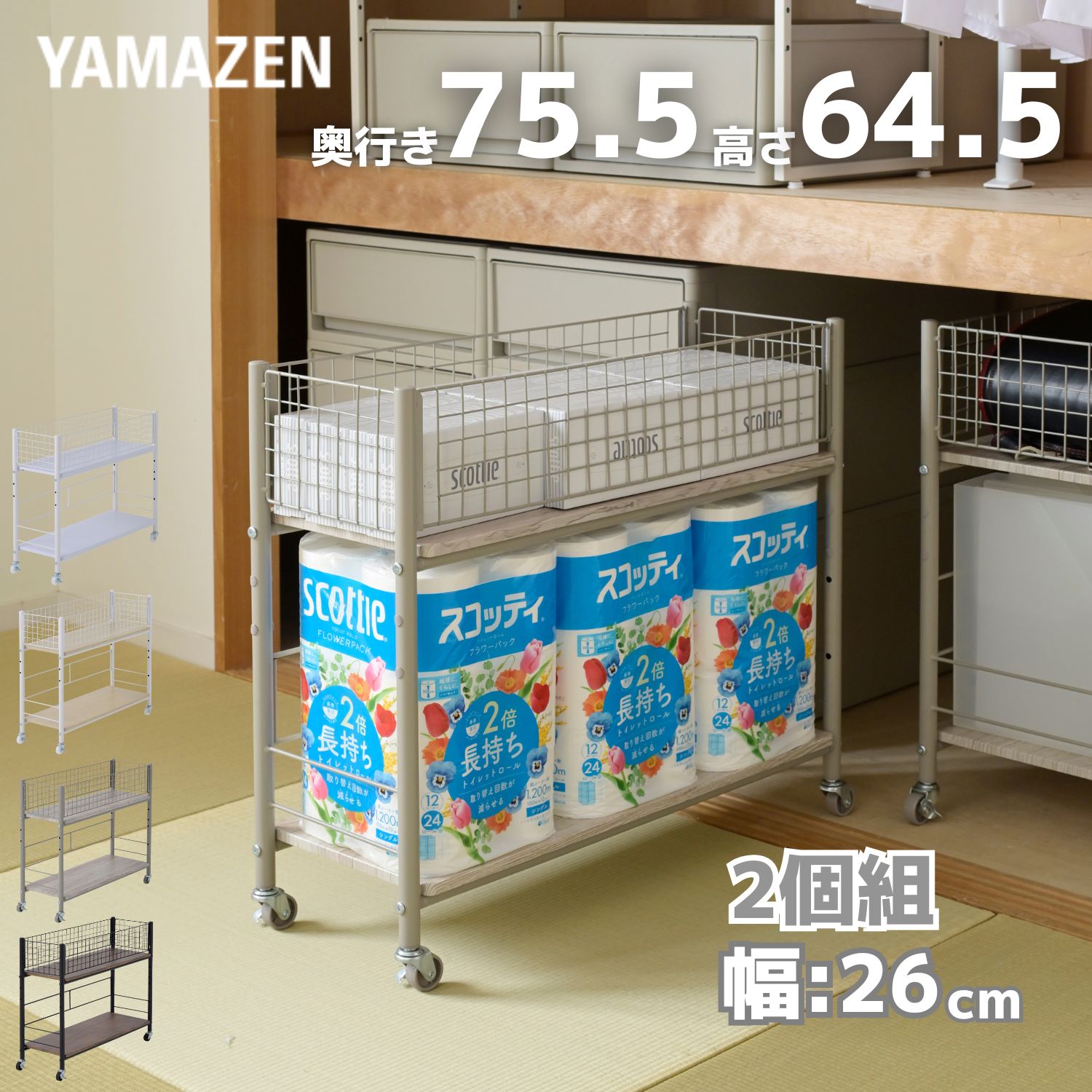 2個組 収納ラック ワゴン キャスター付き 奥行75.5 高さ64.5 幅26cm 押入れ収納 押入れ クローゼット 階段下 バッグ ランドセル ペットボトルボトル 収納 山善