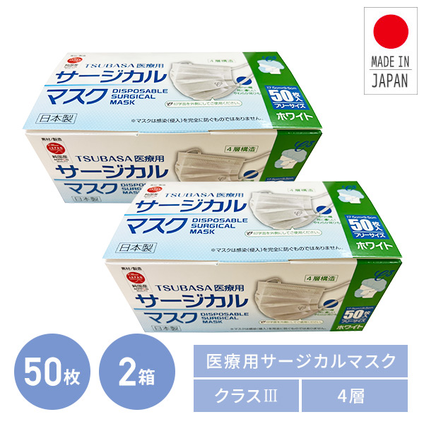日本製 4層式 サージカルマスク 医療用マスク クラス3 100枚 (50枚入×2箱) ホワイト マスク 使い捨てマスク ウイルス 細菌 飛沫 防塵 花粉 感染対策 つばさ
