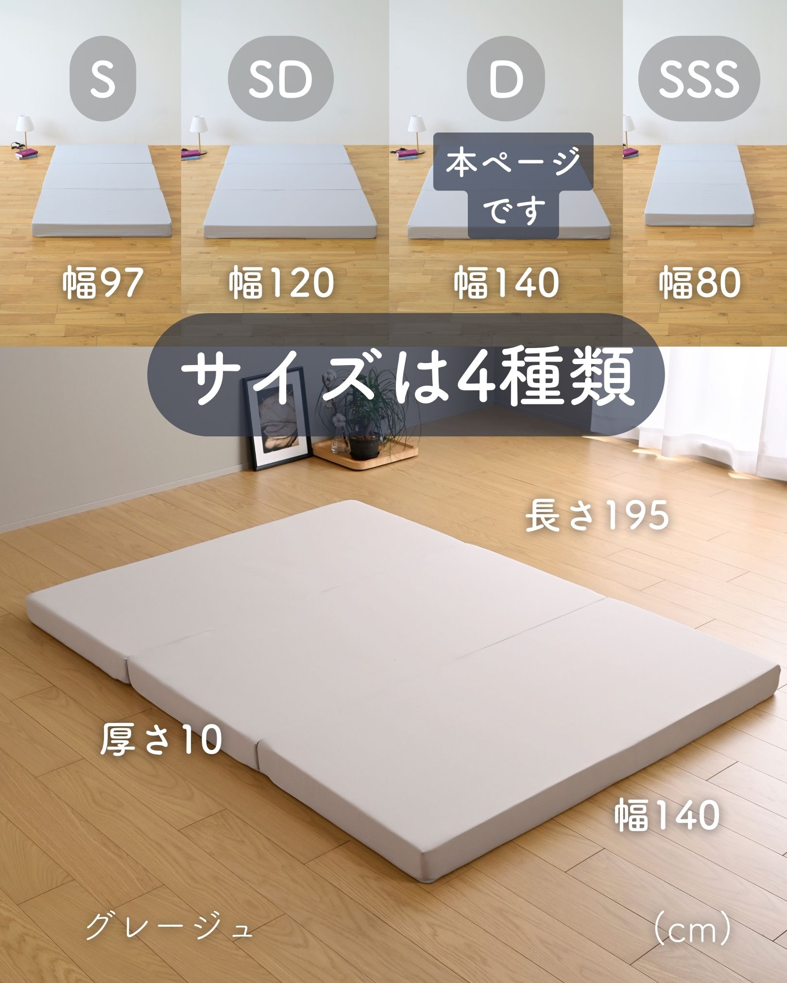 ●かたさ200N(ニュートン):【参考】スタッフ所感は、体重40kgの人で沈まずかために感じ、体重80kgの人で沈み込むものの底付きはしない感じです。