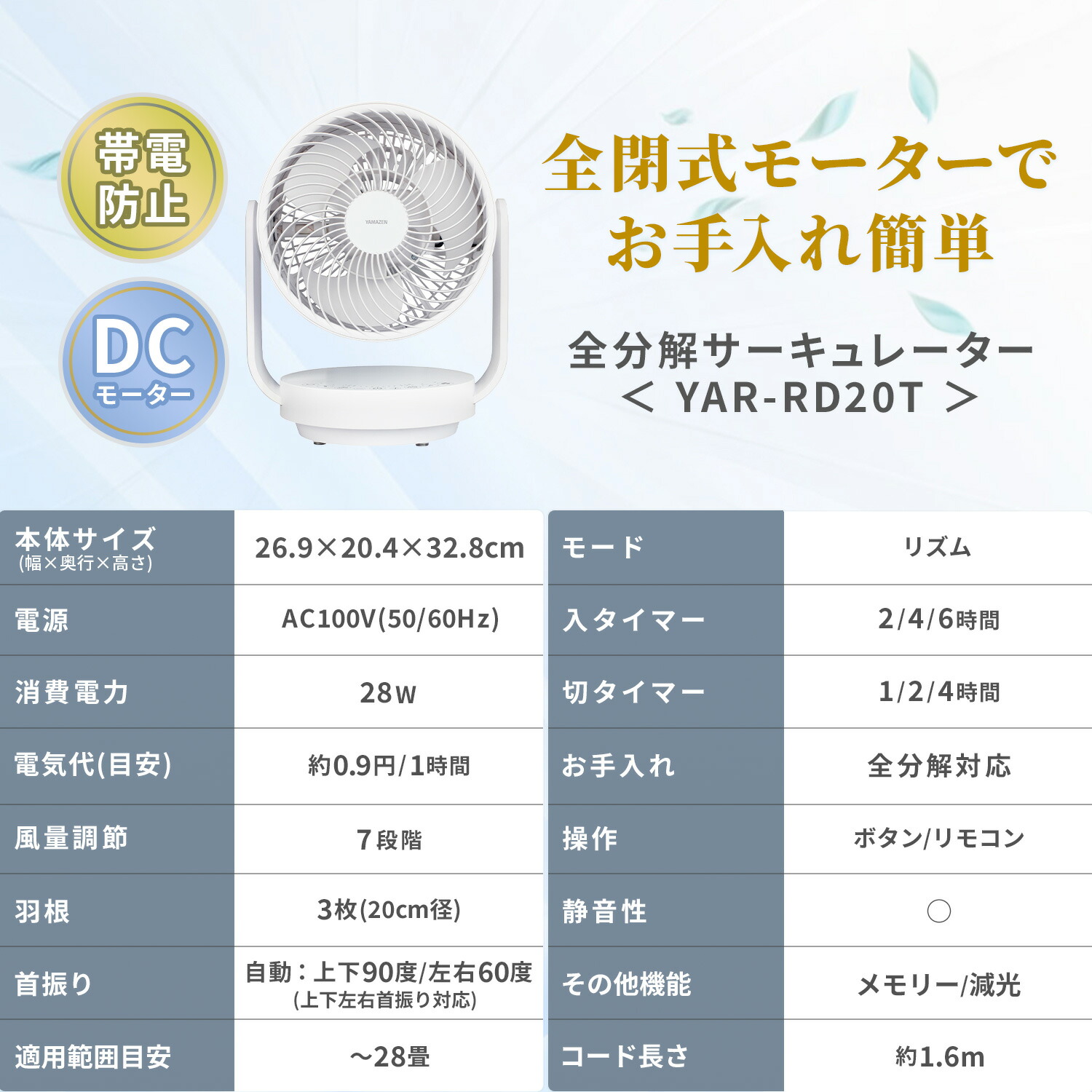 洗える サーキュレーター DCモーター 全分解サーキュレーター 上下左右首振り 28畳まで 帯電防止加工 静音 全閉式 YAR-RD20T 扇風機 山善