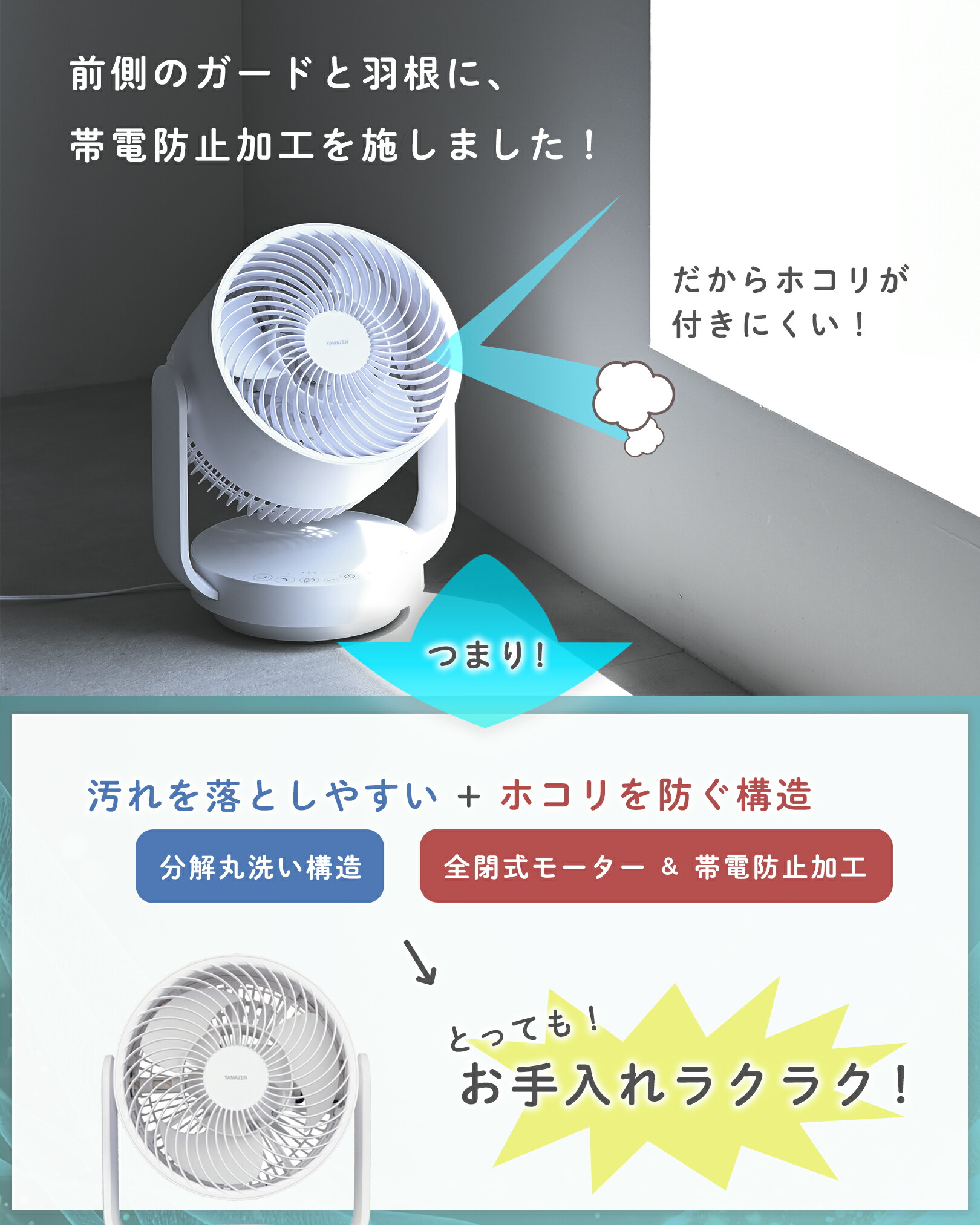 ●帯電防止加工:前ガードと羽根は帯電防止加工を施してほこりが付着しにくい
