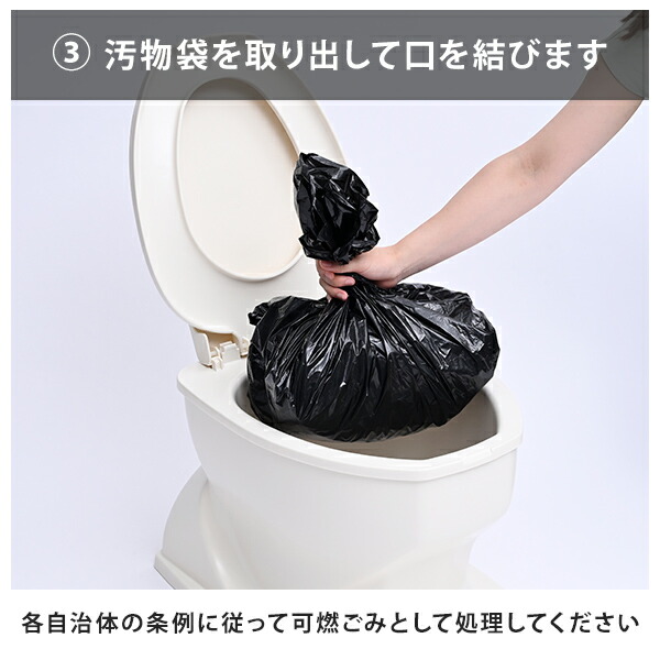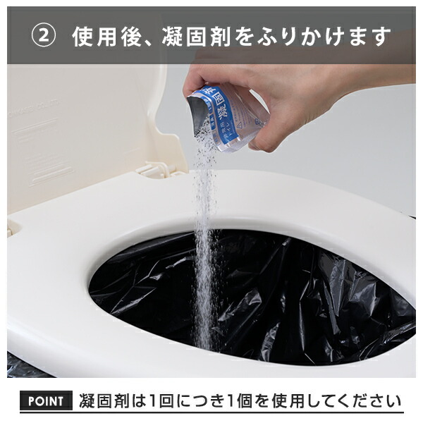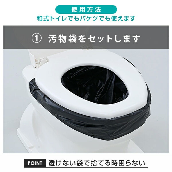 ●使用方法:便座を上げた状態で汚物袋をかぶせます。使用後、凝固剤を振りかけます。汚物袋を取り出し、口を結びます。各自治体の指示に従って廃棄してください