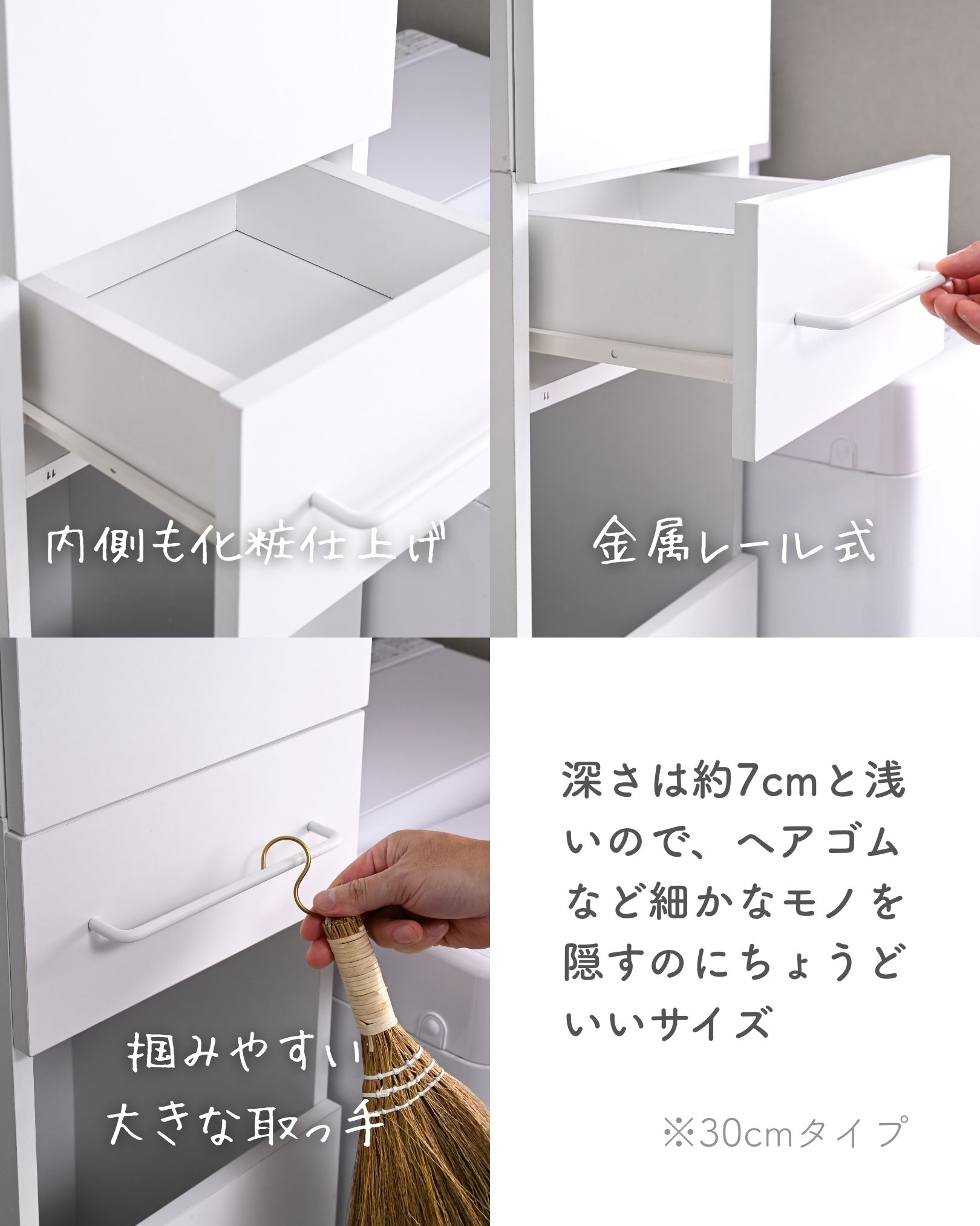 ●引き出しは抜け落ちを防いで出し入れを助ける、金属レール付き