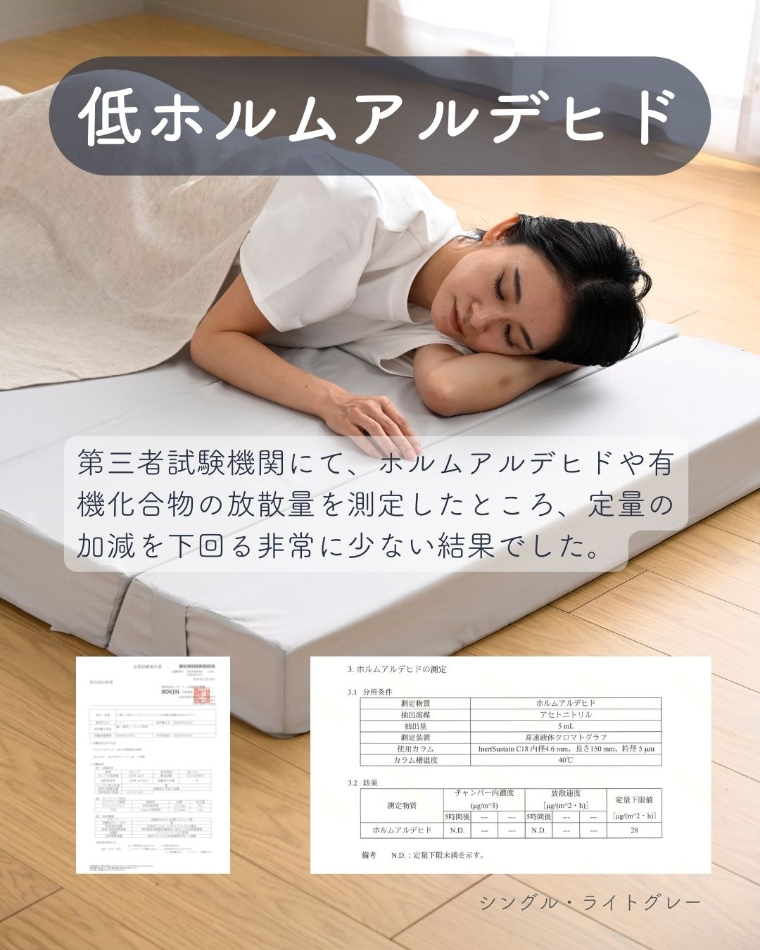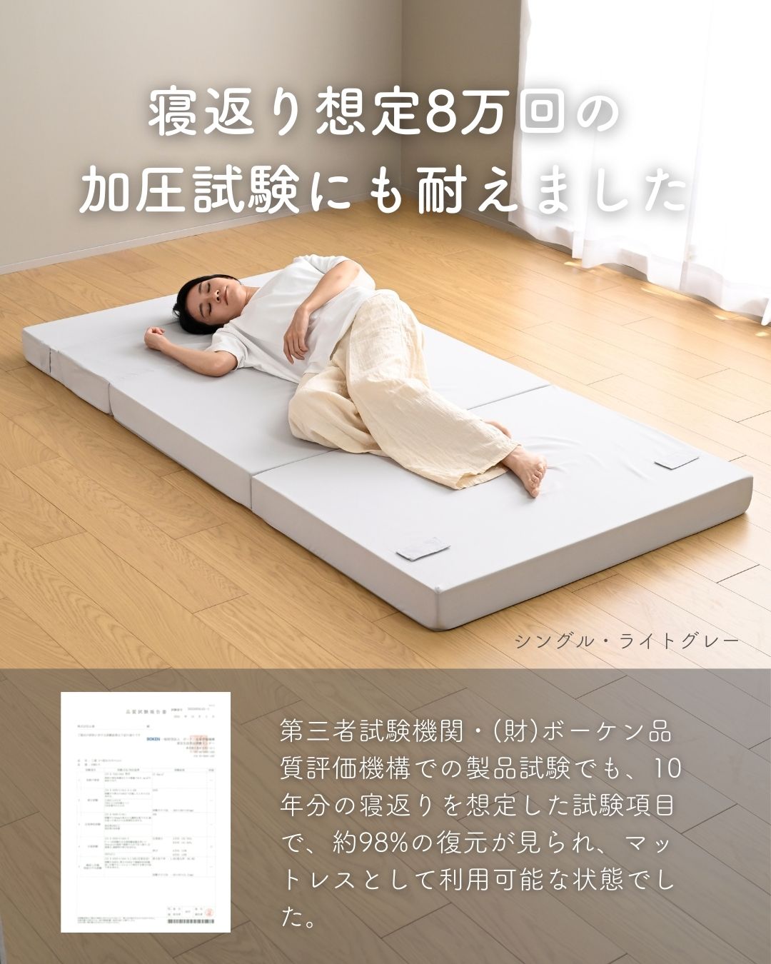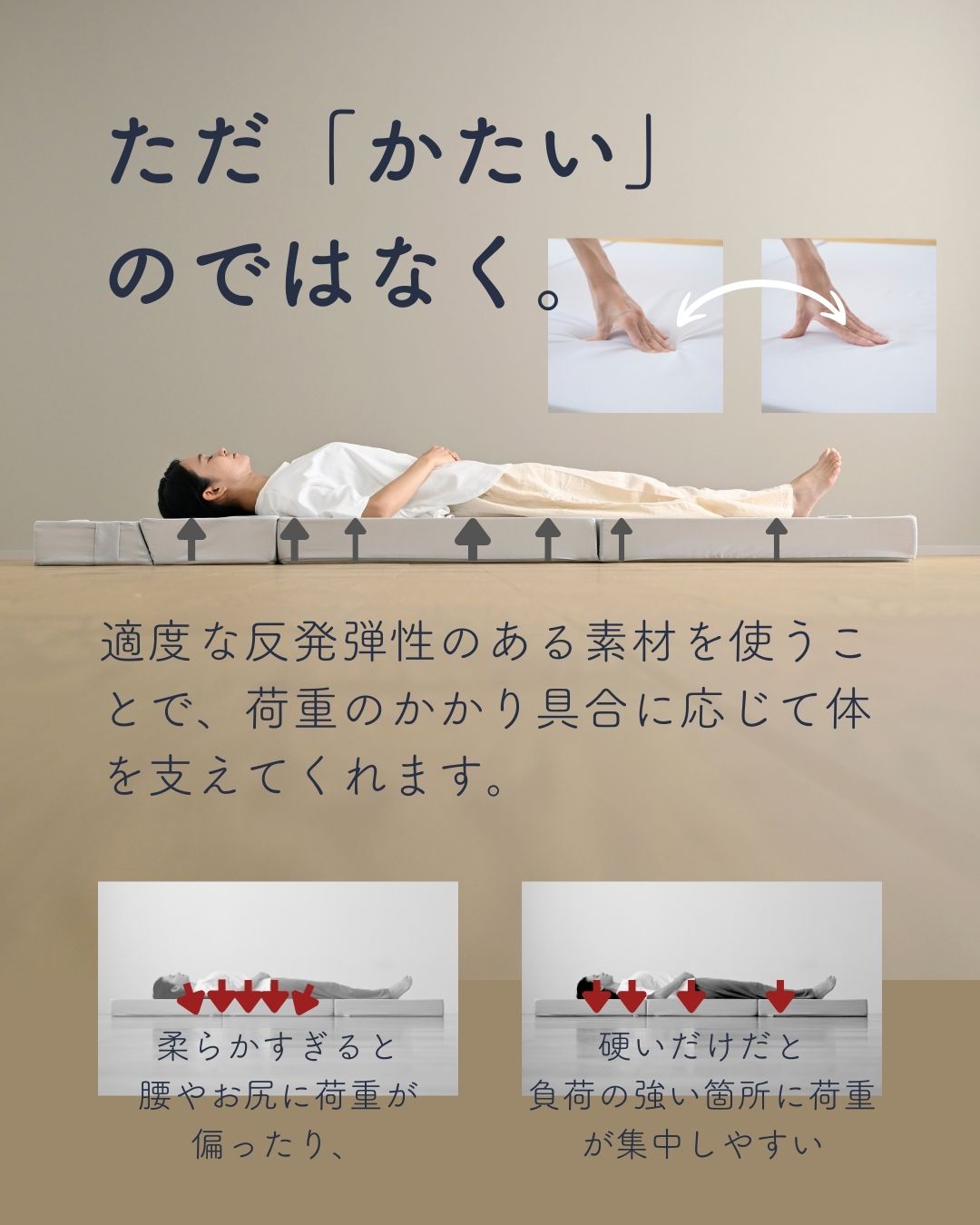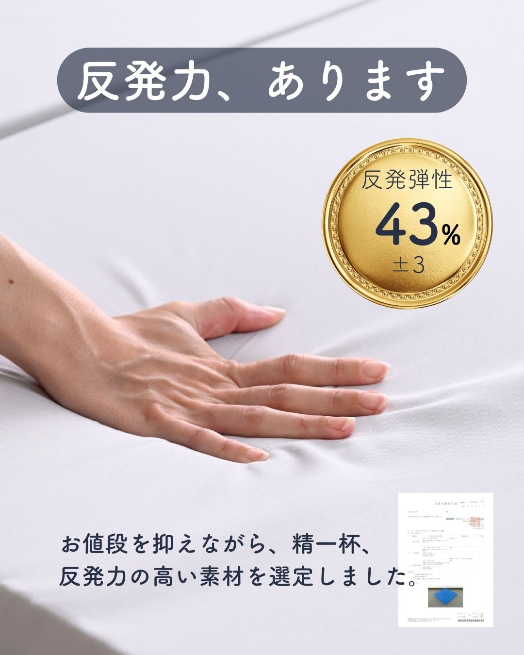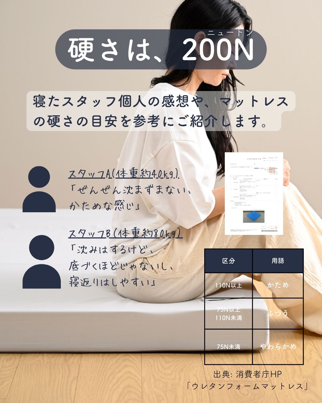 ●かたさ200N(ニュートン):【参考】スタッフ所感は、体重40kgの人で沈まずかために感じ、体重80kgの人で沈み込むものの底付きはしない感じです。